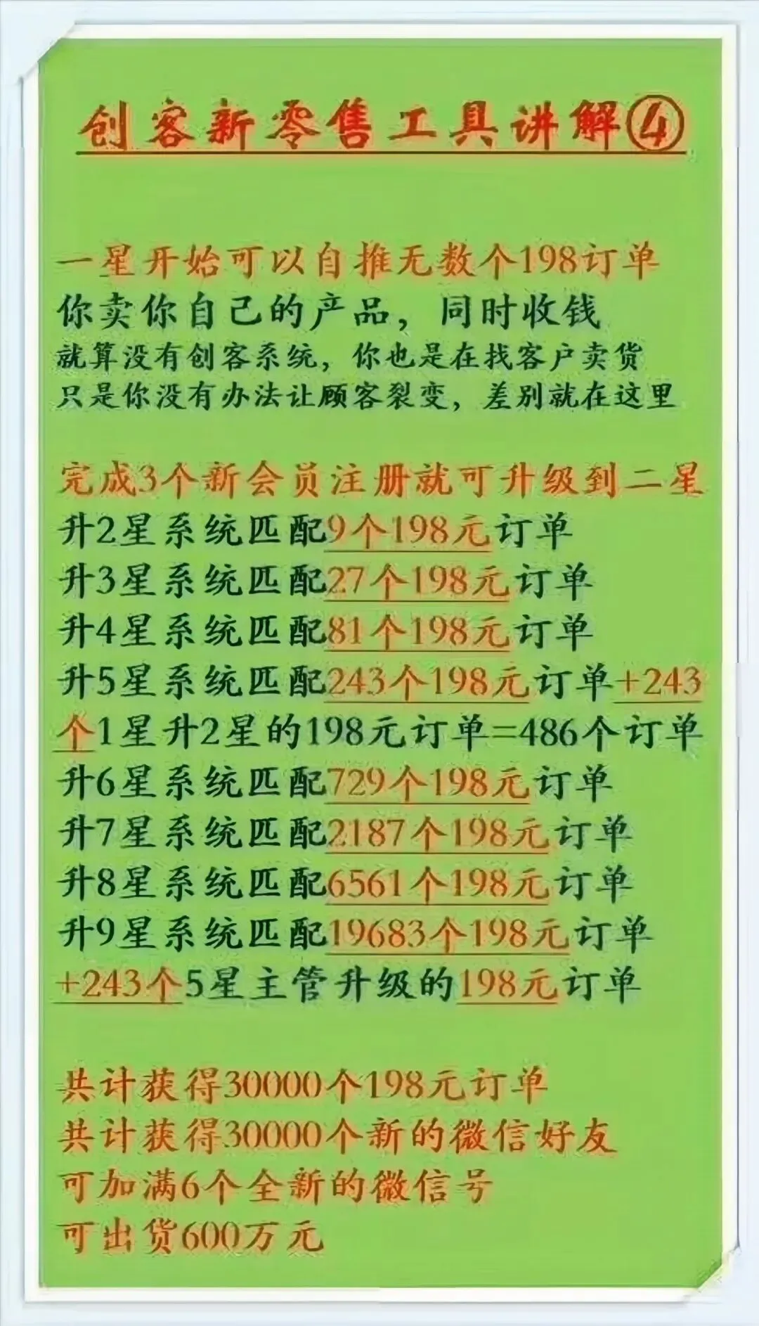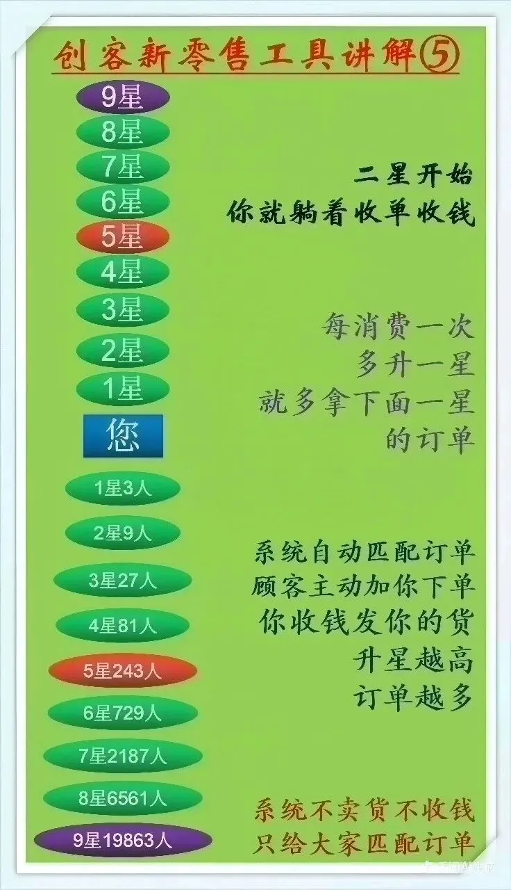 如果说你给了他用这个工具,他会造成一定的负面,会说你骗他两个198,会说你这个工具不好用,说没有价值。大家会发现一个细节,凡是成功的人都是比较喜欢帮助别人,成就别人,才能成就自己,大家想一想,我们的伟大领袖毛主席曾经写过五个大字,为人民服务,他有服务人民之心,所以说人民成就了他。(边写边讲解)九星创客工具的核心价值就是:利他。当我们找到合适的商家的时候,他成就别人两单生意的同时,他也获得了个门面,那么有了门面,有了营业执照,我们只需要发现身边有没有想卖货的人,就可以帮助三个商家,那么我们就建立了第1度人脉。同样的道理,第1度人脉的三个商家它可以帮助我们每一个人要成交一单生意,那么打个比方每一单生意那么大概100元利润左右,我们至少获得了300元的利润。同样的道理,第1度人脉她想卖货,她就一定也会去帮助三个商家卖货,这样第2度人脉是九个商家,九个商家意味着就有900元的利润,对吗?如果说我们想赚这900块钱的利润,我们就只需要花198,找我们的二星商家去消费单产品,接下来系统就会匹配九个订单买我们的九个产品,让我们获得900元的利润。同样的道理那么第3度人脉就是27个,27个意味着就将近有2700元的利润,我们只需要找到三星商家消费一单198的产品,那么就可以获得27个订单。到了第4度人脉,只需要找四星商家消费一单198,接下来就会有81个订单推送给我们。我们发展到第5度人脉的时候,直接找五星商家消费一单产品,我们就获得了第243个订单。第6度人脉的时候我们获得了729个第7度人脉的时候我们获得了2187个订单,第8度人脉我们获得了6561个订单。当我们团队的总人数达到了81个一星及以上的时候,找九星商家消费两个198,就可以升为九星商家,9度人脉所获得的订单是19683个订单乘以二,就是39366个订单。