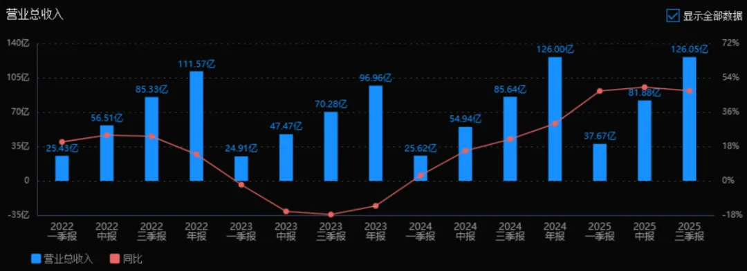 1)营业总收入:2025年三季度的营业总收入为126.05亿元,相较于2024年三季度的85.64亿元,增长47.19%。评价: 营业收入实现高速增长,表明公司业务扩张迅速,市场表现强劲。