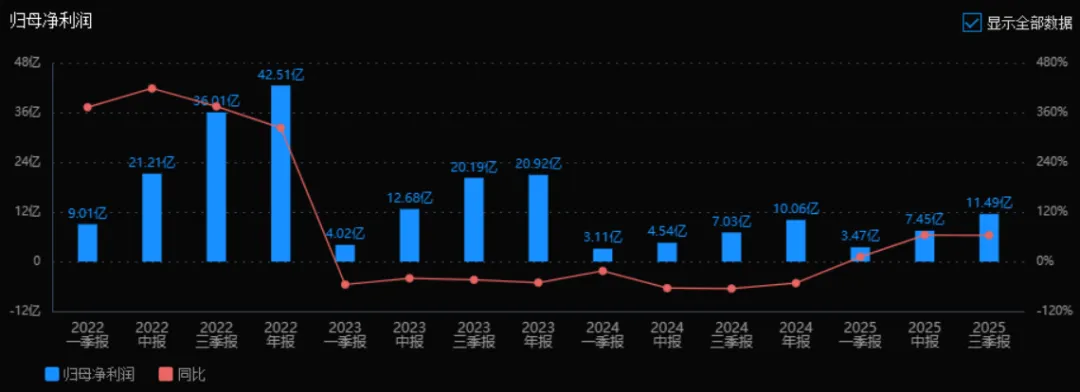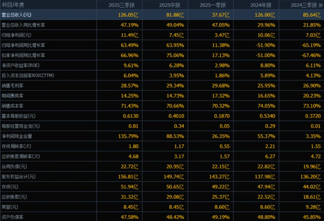 2)归母净利润:2025年三季度的归母净利润为11.49亿元,相较于2024年三季度的7.03亿元,增长63.49%。评价: 净利润增速高于收入增速,说明公司在盈利能力方面有显著改善,成本控制或产品结构优化效果明显。