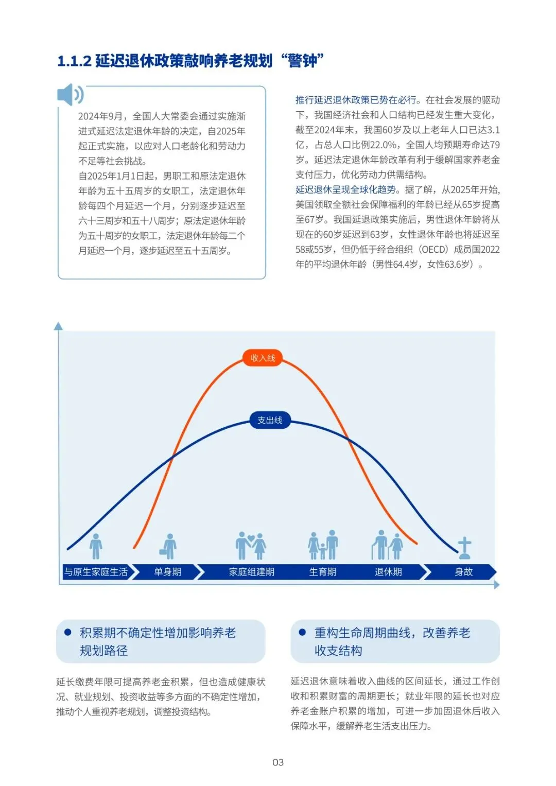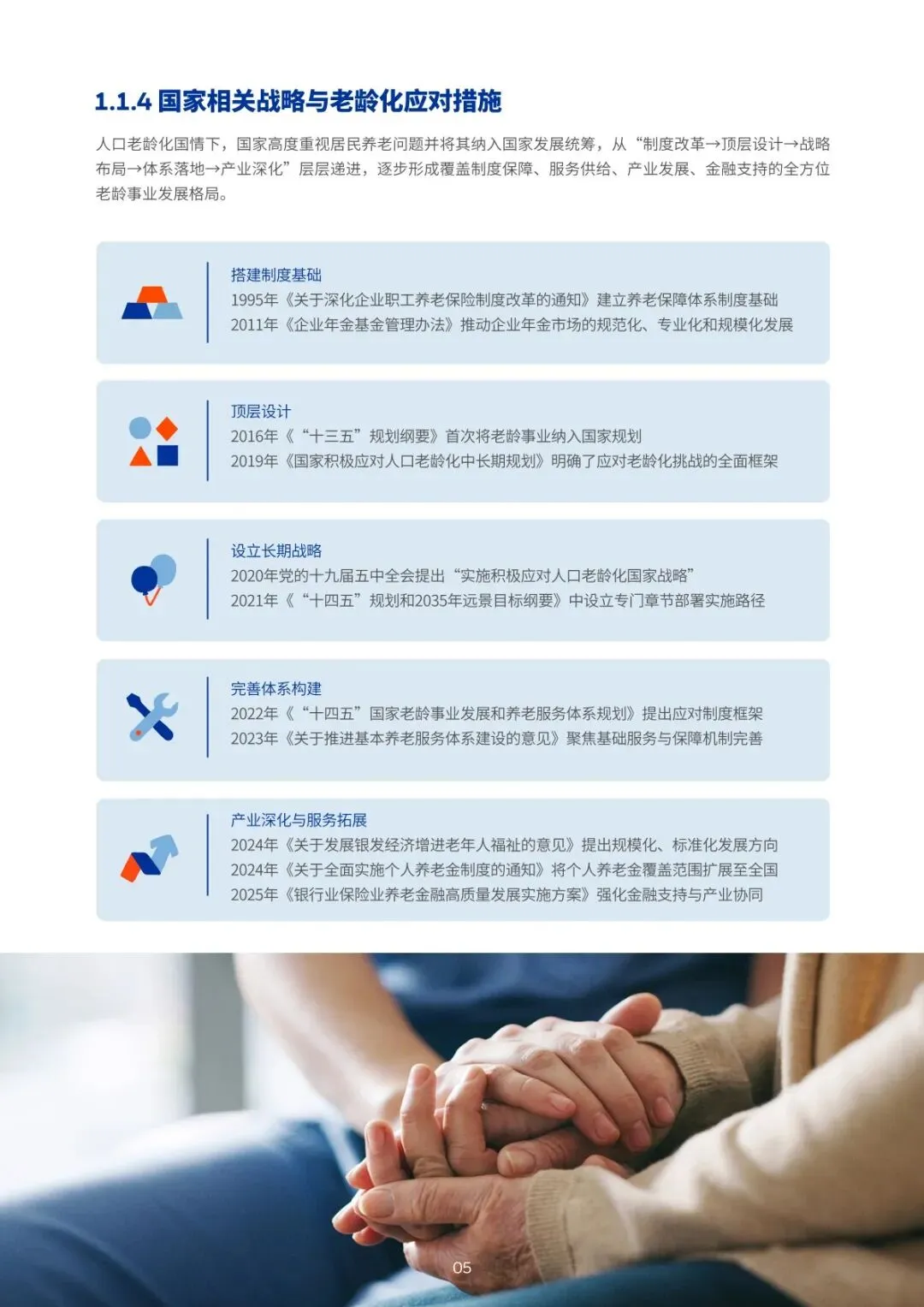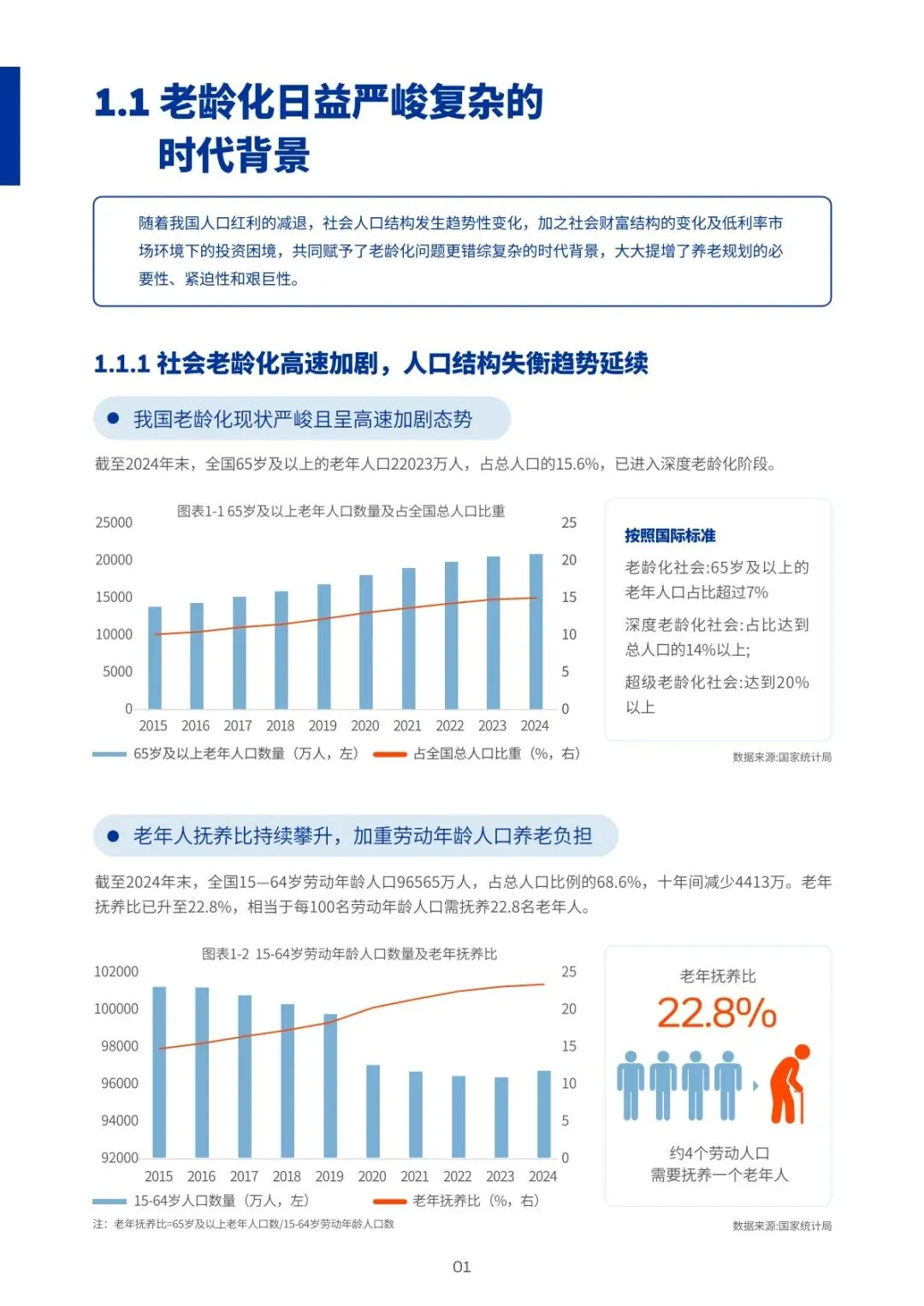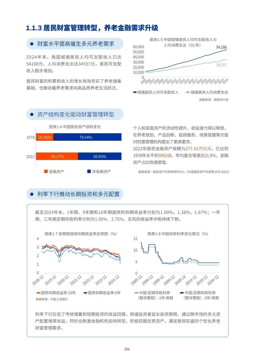 老龄化加剧叠加制度压力,养老金融需求迫切。2024 年末我国 65 岁及以上老年人口达 2.2 亿,占比 15.6%,老年抚养比升至 22.8%,人口负增长与延迟退休政策进一步凸显养老规划重要性。三支柱养老金体系中,第一支柱 “一支独大” 但偿付承压,替代率约 45%;第二支柱覆盖不足 3%;第三支柱虽全面推行,但开户率仅 7%,缴费率不足 21%,供需缺口为养老金融发展提供空间。 居民养老意识觉醒,但认知与行为存在错配。67% 受访者担忧养老收入不足,59% 顾虑医疗支出增加,但仅 32.1% 接受过专业养老规划指导。居民保本执念强烈,65% 将 “本金安全” 作为产品首要诉求,34% 完全不接受浮亏;储蓄习惯根深蒂固,但仅 20% 资金专项用于养老,未形成系统规划,年轻群体存在 “时间贴现心理”,中老年受大额支出挤占储备资金。 养老金融产品多元,制度化与非制度化双轮驱动。制度化产品以个人养老金账户为核心,涵盖理财、基金、保险、储蓄四类,2024 年末产品超 460 只,强调税收优惠与稳健运作;非制度化产品包括养老理财、商业养老金、养老信托等,满足细分需求,如养老理财规模突破千亿,商业养老金试点规模超 1166 亿元,养老信托通过 “金融 + 非金融” 服务适配高净值人群。 人群需求分化显著,代际差异影响养老决策。女性养老焦虑更突出,规划启动时间更早;30-50 岁是养老规划核心阶段,高学历人群意识觉醒更早。年轻群体关注收益与灵活性,银发族侧重安全与实用,高收入人群更看重风险与收益平衡。养老方式上,55% 受访者倾向居家养老,年轻群体对机构养老接受度更高,“养儿防老” 观念淡化,86% 受访者将基本养老金作为主要收入来源。 机构积极布局,生态化服务成发展方向。建设银行构建 “1314” 养老金融服务体系,整合集团子公司资源推出 “健养安” 品牌;建信基金、建信人寿等机构聚焦产品创新与服务升级,如贝莱德建信理财推出十年期养老理财,建信人寿构建 “悦享金生” 养老服务生态。行业趋势呈现产品长期化、服务综合化、运营数字化特征,机构通过跨领域协同,满足居民多元化养老需求。