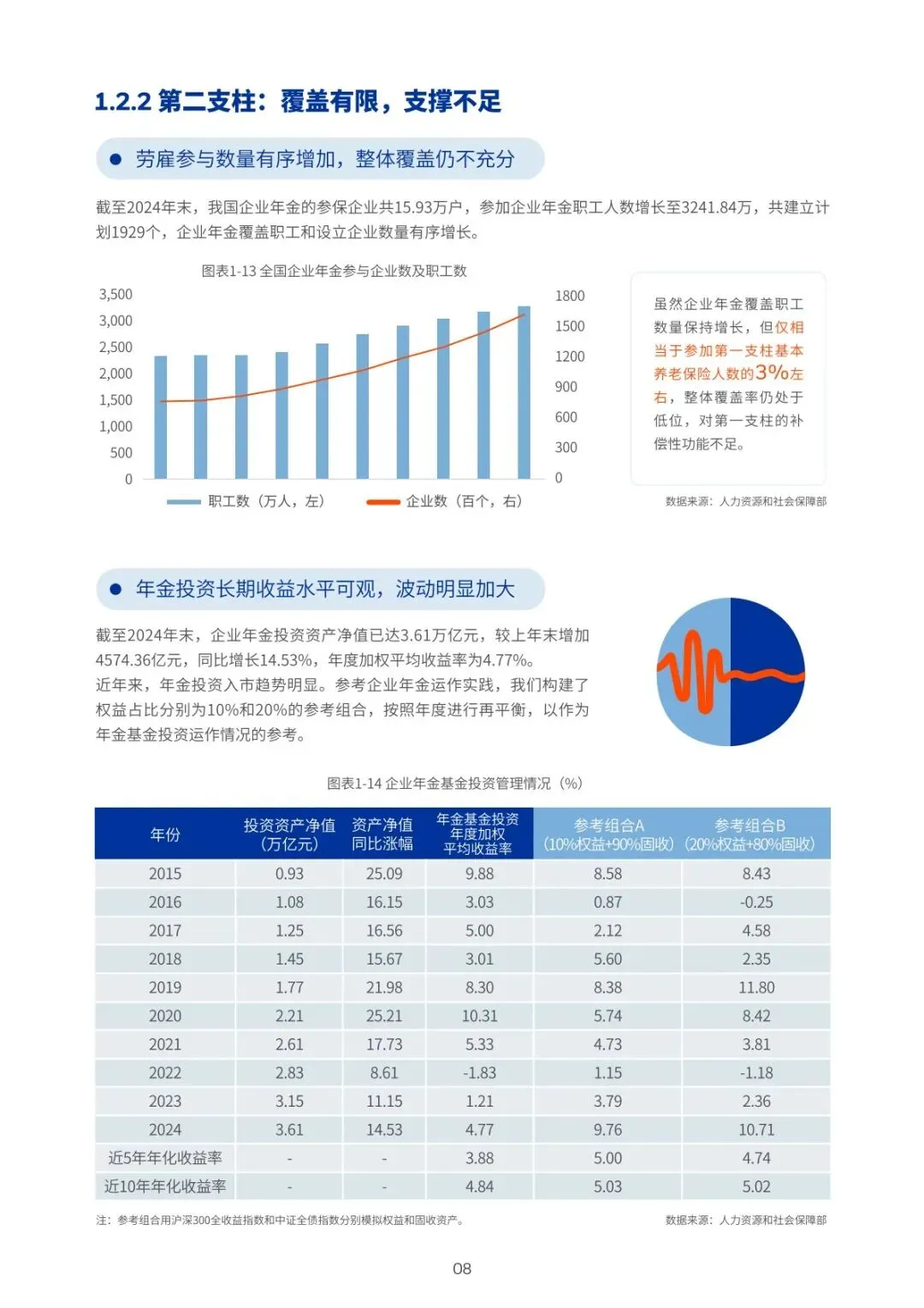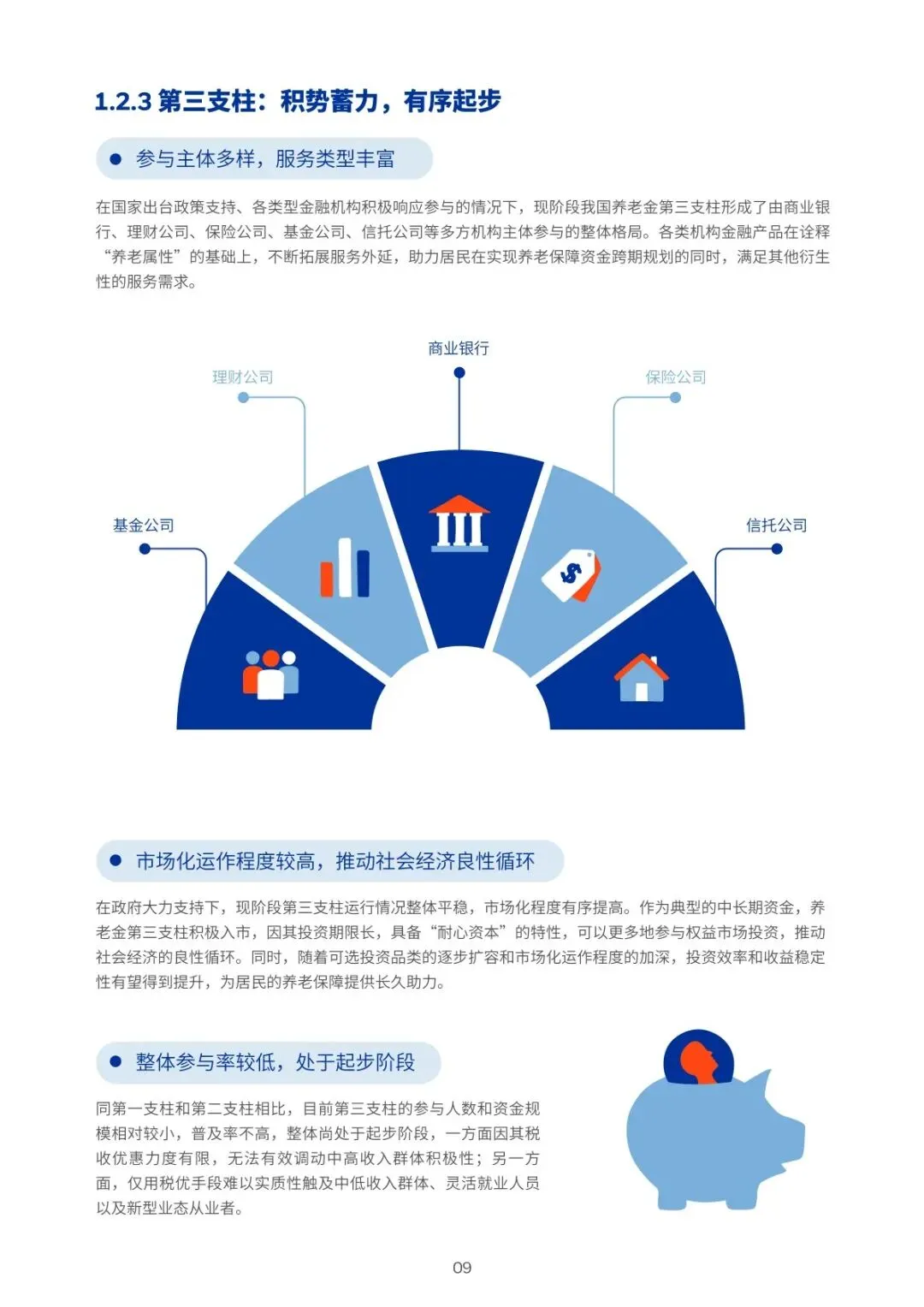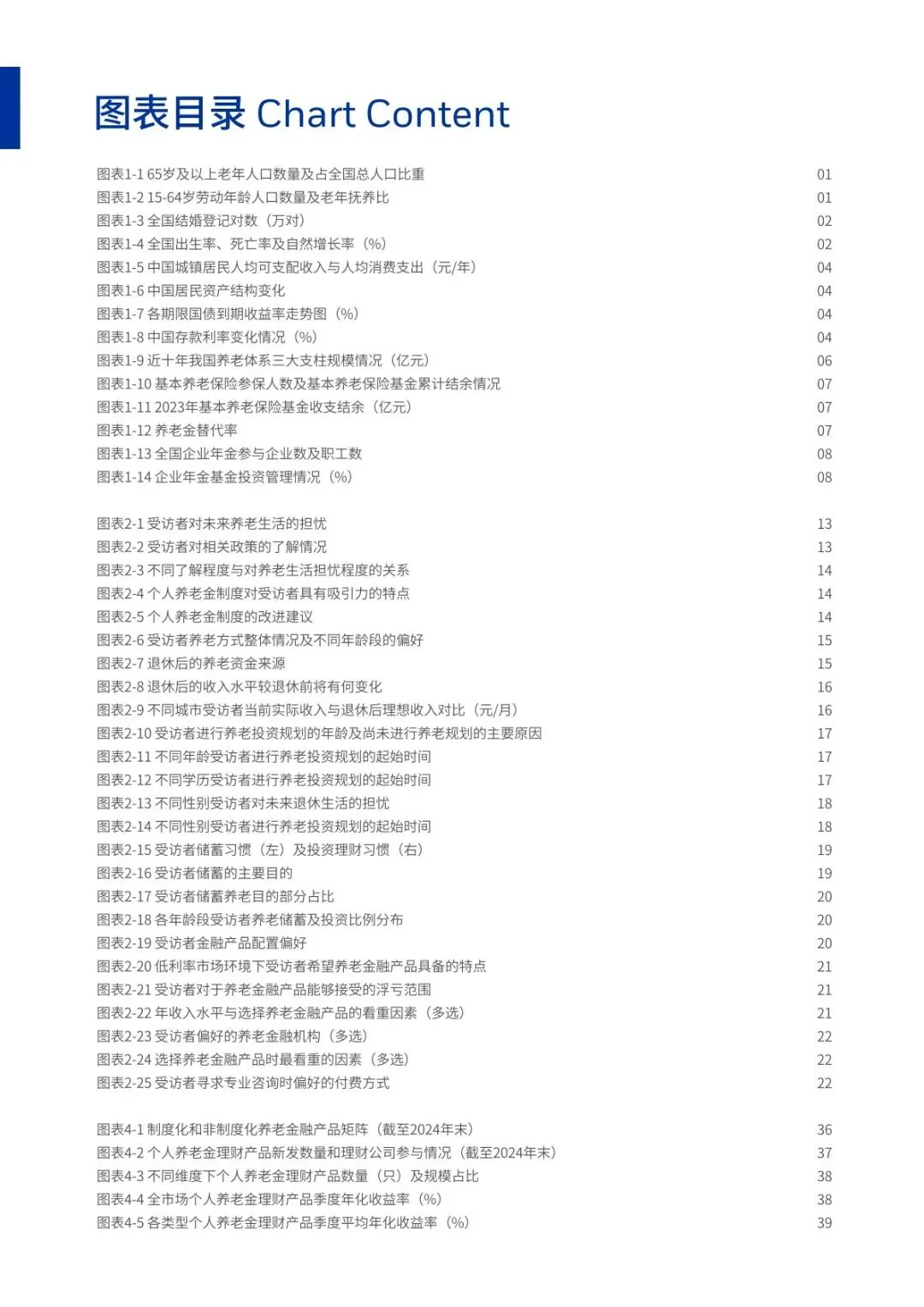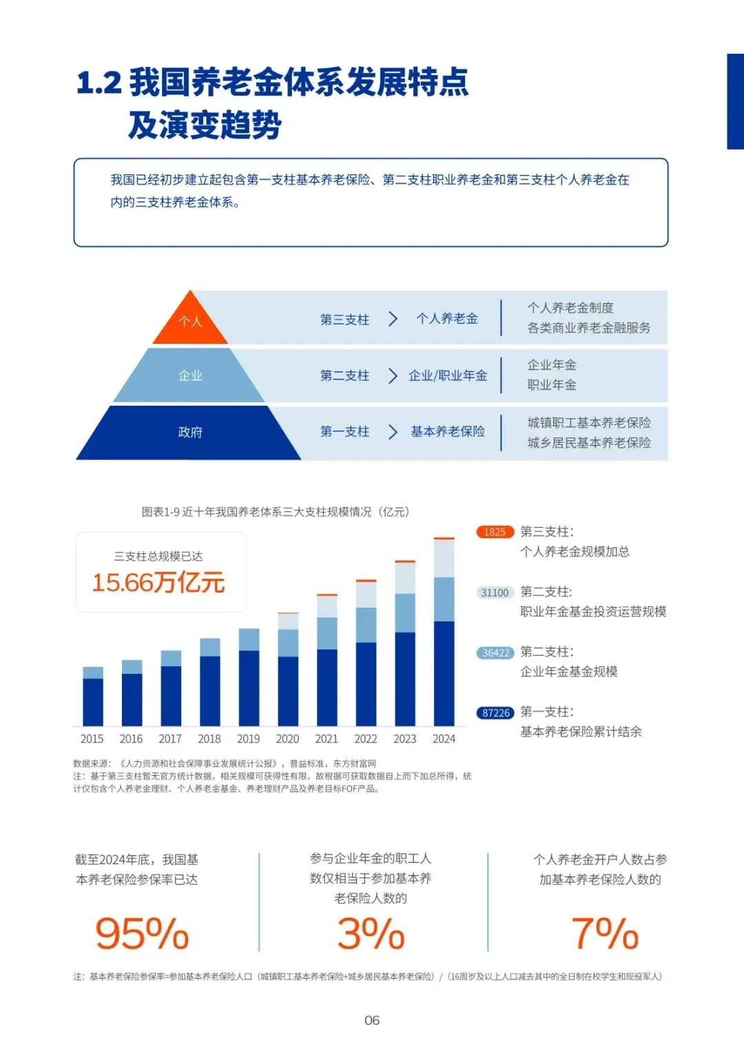 老龄化加剧叠加制度压力,养老金融需求迫切。2024 年末我国 65 岁及以上老年人口达 2.2 亿,占比 15.6%,老年抚养比升至 22.8%,人口负增长与延迟退休政策进一步凸显养老规划重要性。三支柱养老金体系中,第一支柱 “一支独大” 但偿付承压,替代率约 45%;第二支柱覆盖不足 3%;第三支柱虽全面推行,但开户率仅 7%,缴费率不足 21%,供需缺口为养老金融发展提供空间。 居民养老意识觉醒,但认知与行为存在错配。67% 受访者担忧养老收入不足,59% 顾虑医疗支出增加,但仅 32.1% 接受过专业养老规划指导。居民保本执念强烈,65% 将 “本金安全” 作为产品首要诉求,34% 完全不接受浮亏;储蓄习惯根深蒂固,但仅 20% 资金专项用于养老,未形成系统规划,年轻群体存在 “时间贴现心理”,中老年受大额支出挤占储备资金。 养老金融产品多元,制度化与非制度化双轮驱动。制度化产品以个人养老金账户为核心,涵盖理财、基金、保险、储蓄四类,2024 年末产品超 460 只,强调税收优惠与稳健运作;非制度化产品包括养老理财、商业养老金、养老信托等,满足细分需求,如养老理财规模突破千亿,商业养老金试点规模超 1166 亿元,养老信托通过 “金融 + 非金融” 服务适配高净值人群。 人群需求分化显著,代际差异影响养老决策。女性养老焦虑更突出,规划启动时间更早;30-50 岁是养老规划核心阶段,高学历人群意识觉醒更早。年轻群体关注收益与灵活性,银发族侧重安全与实用,高收入人群更看重风险与收益平衡。养老方式上,55% 受访者倾向居家养老,年轻群体对机构养老接受度更高,“养儿防老” 观念淡化,86% 受访者将基本养老金作为主要收入来源。 机构积极布局,生态化服务成发展方向。建设银行构建 “1314” 养老金融服务体系,整合集团子公司资源推出 “健养安” 品牌;建信基金、建信人寿等机构聚焦产品创新与服务升级,如贝莱德建信理财推出十年期养老理财,建信人寿构建 “悦享金生” 养老服务生态。行业趋势呈现产品长期化、服务综合化、运营数字化特征,机构通过跨领域协同,满足居民多元化养老需求。
