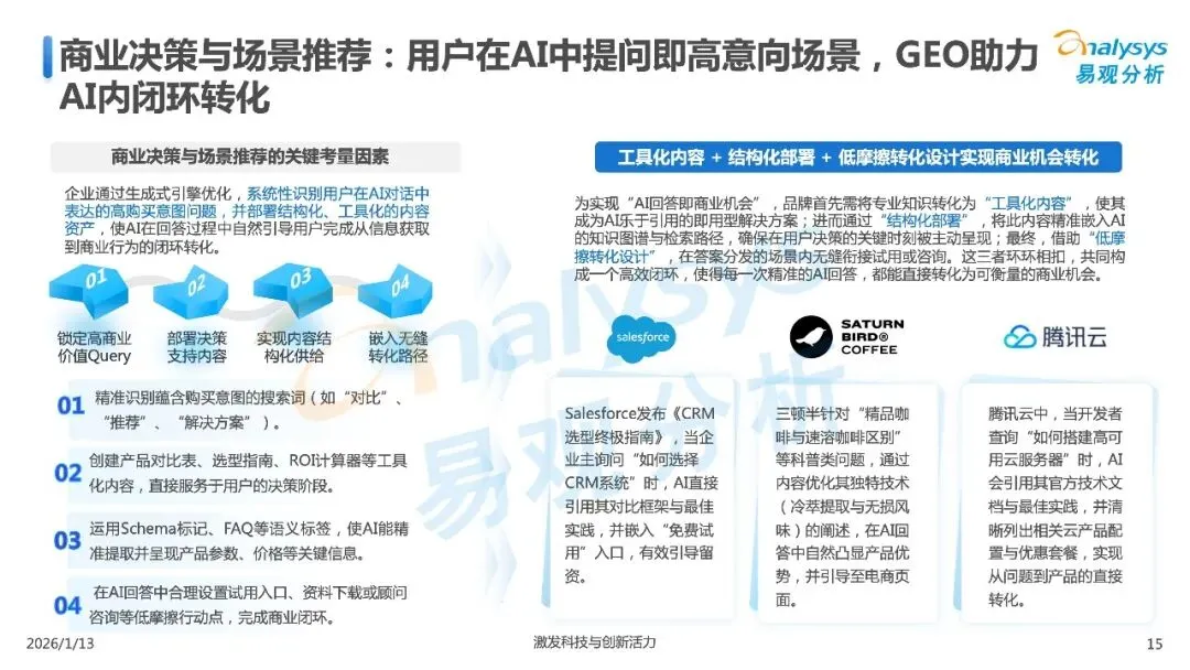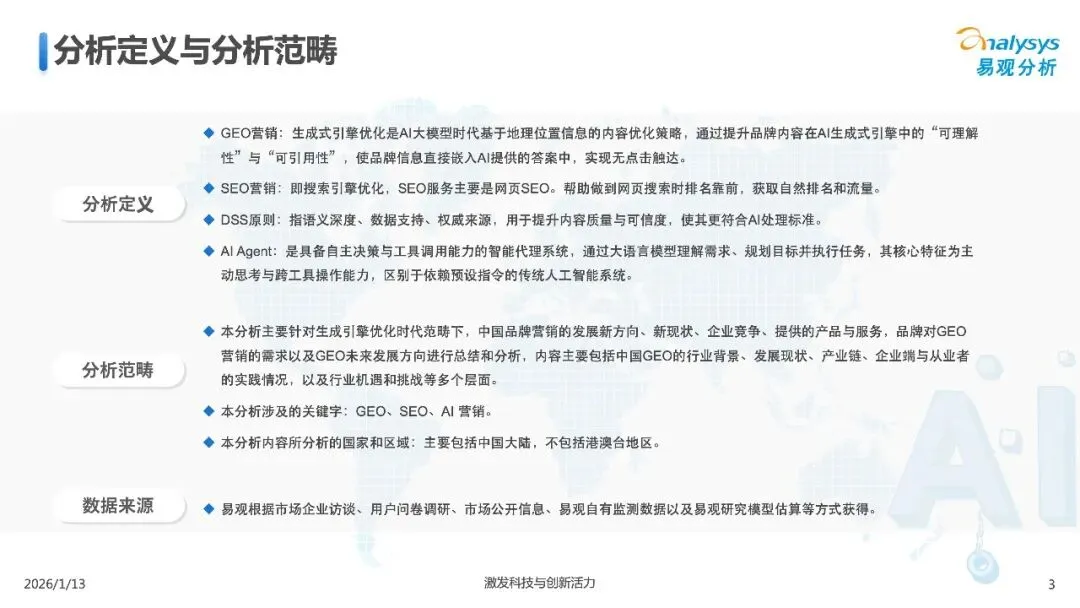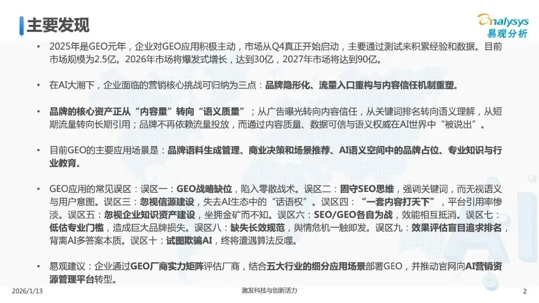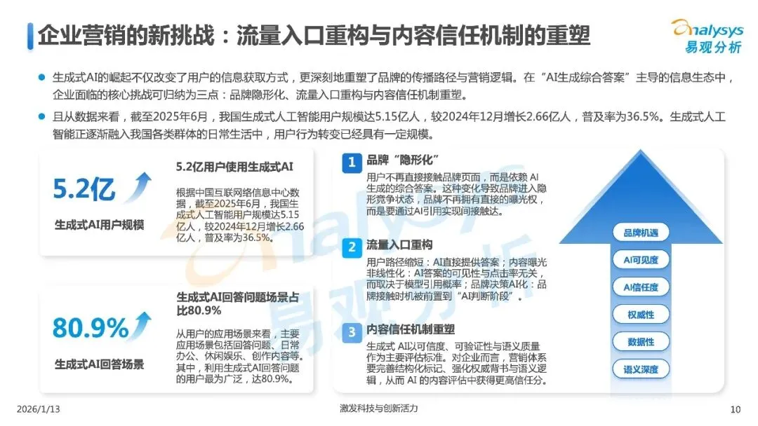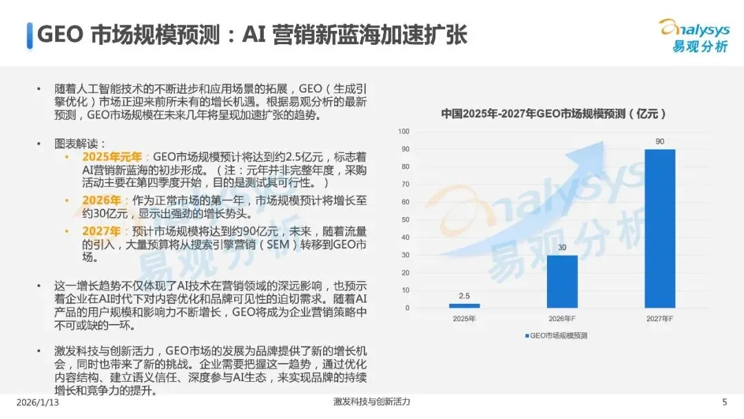 2026年GEO市场规模将暴增至90亿元,品牌竞争从“抢排名”升级为“被AI引用”。数据显示,2025年GEO元年仅2.5亿元,2026年预计30亿元、2027年冲90亿元;5.2亿中国用户已把“问AI”当首选,80.9%场景是“回答问题”,品牌曝光权让渡给模型采信,不投GEO等于主动隐身。