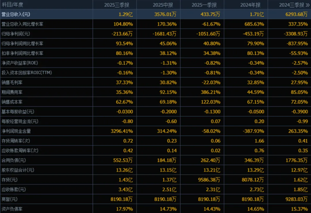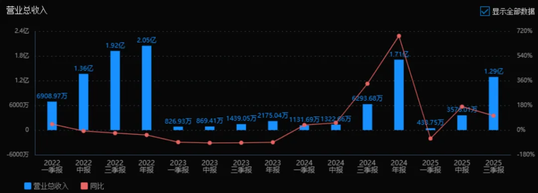 2025年三季报营业总收入为1.29亿元,相较于2024年三季报的6293.68万元,同比增长104.80%。