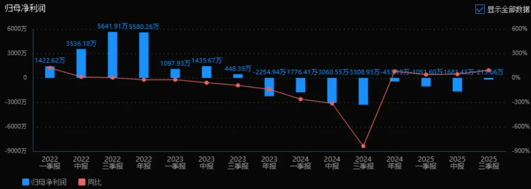 2025年三季报归母净利润为-213.66万元,相较于2024年三季报的-3308.93万元,同比增长93.54%。