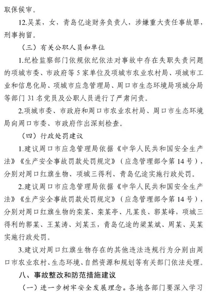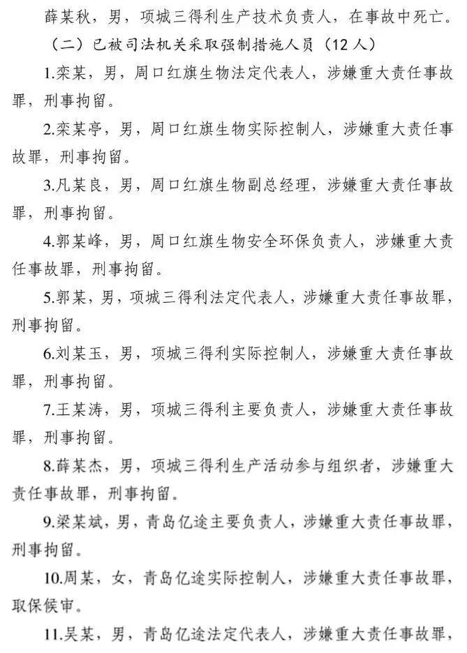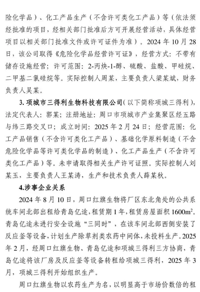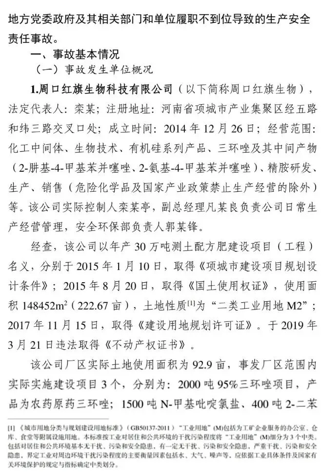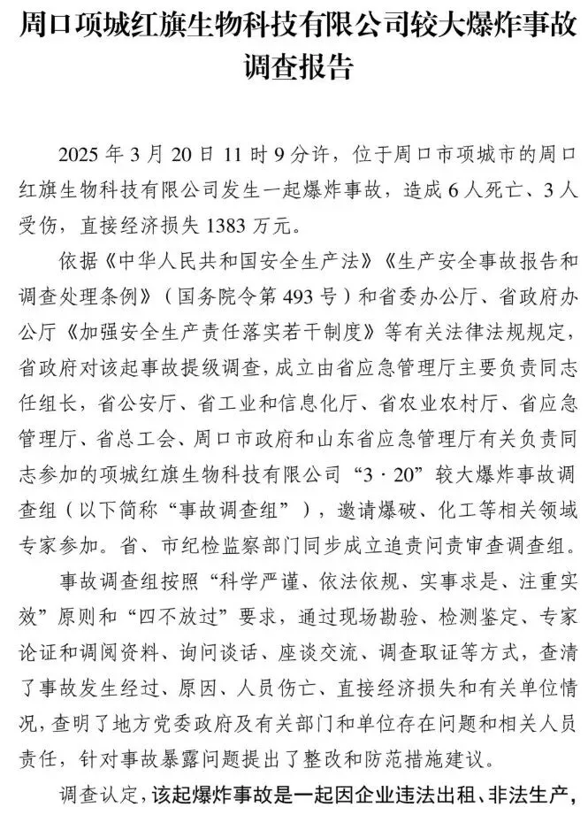 2025年3月20日11时9分许,位于周口市项城市的周口红旗生物科技有限公司发生一起爆炸事故,造成6人死亡、3人受伤,直接经济损失1383万元。