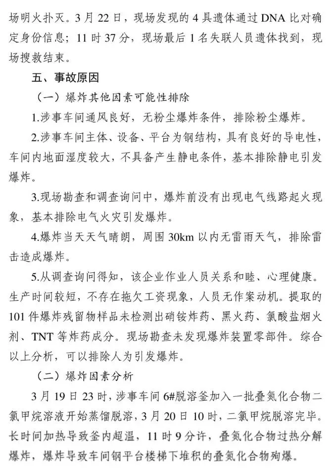 事发车间6#脱溶釜长时间加热导致釜内叠氮化合物超温分解爆炸,引发车间钢平台楼梯下违规堆积的叠氮化合物殉爆,造成生产车间操作人员伤亡,爆炸冲击波导致维修房顶人员坠落、伤亡。