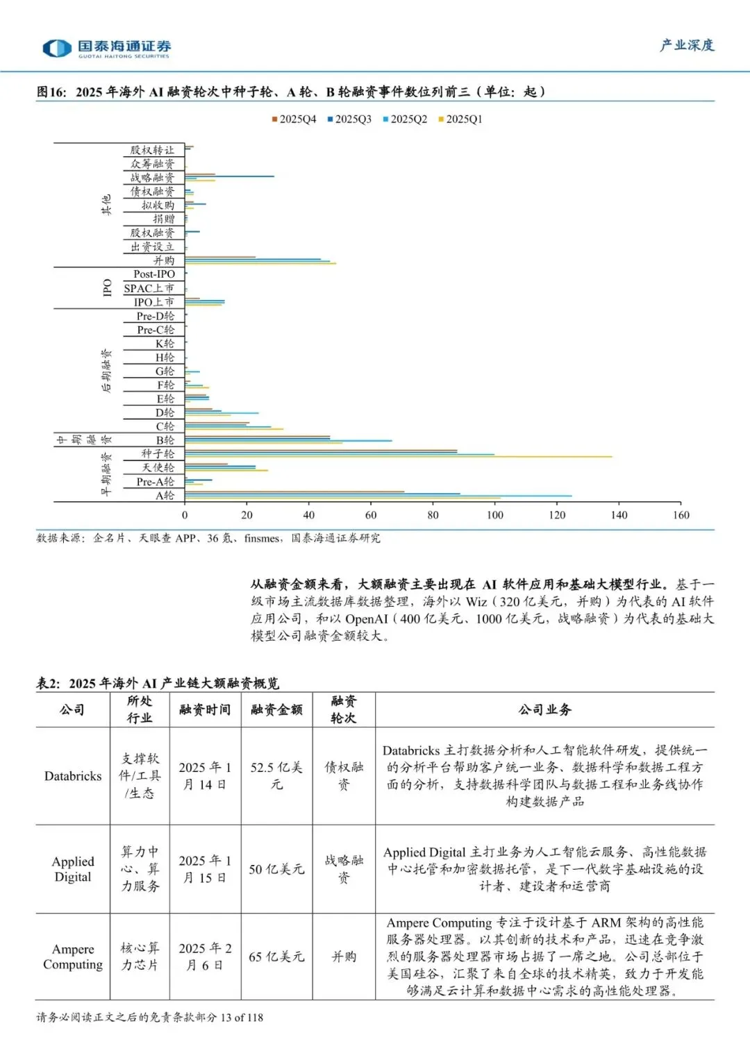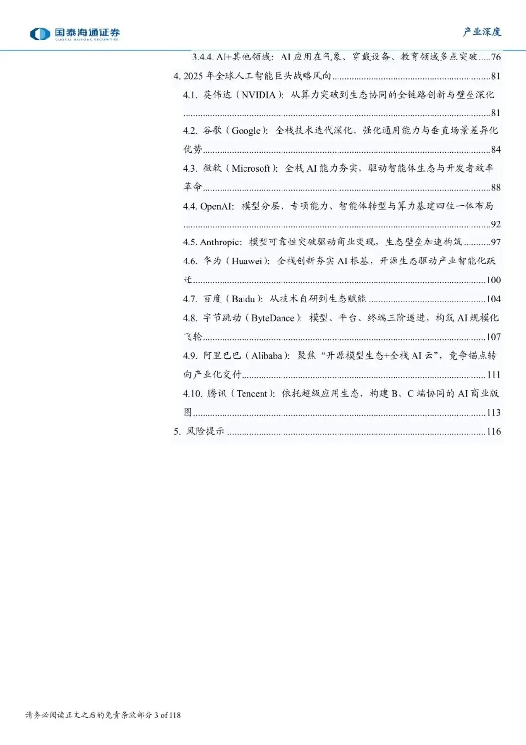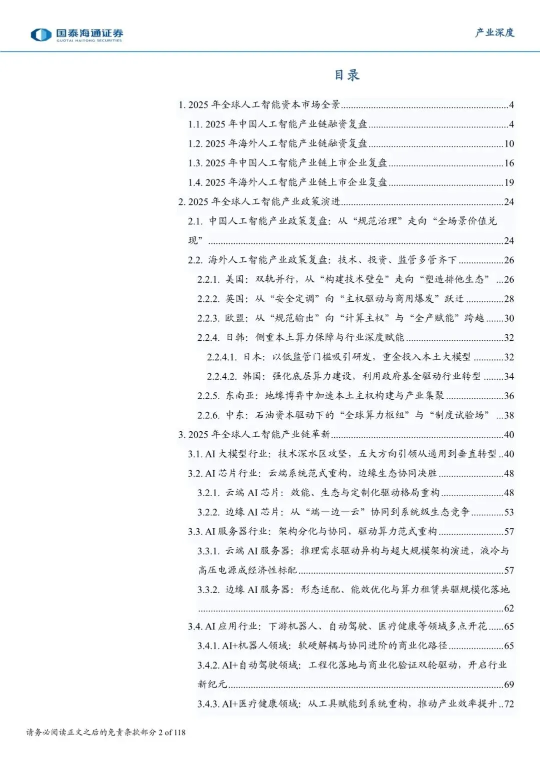 2025年全球人工智能资本市场全景:全球AI投融资呈现出“中国复苏回稳”与“海外审慎重构”的显著分化,资本逻辑完成从“技术幻觉”向“商业实证”的切换。2025年全球人工智能产业政策演进:政策呈现出“主权构建”与“场景牵引”双重特征,各国竞争逻辑已从单纯的安全治理转向国家战略生产力的全面博弈。2025年全球人工智能产业链革新:产业链已由“通用能力竞速”全面步入“系统级能效博弈”与“全场景深度价值闭环”的攻坚阶段,呈现出软硬高度耦合、云边协同演进、商业化交付提速的特征。2025年全球人工智能巨头战略风向:海外AI龙头聚焦智能体范式重构与全球算力基建布局,中国AI 龙头深耕垂直场景交付与开源生态构建。
