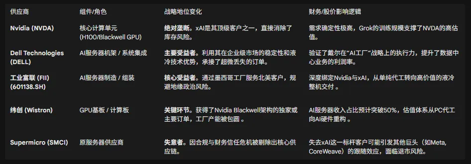 对于上游(硬件): 这是一个确定性的增量市场。xAI的激进扩张将持续利好Nvidia、戴尔、工业富联和纬创等具备高性能计算交付能力的厂商。液冷技术和能源基础设施将成为下一个投资风口。