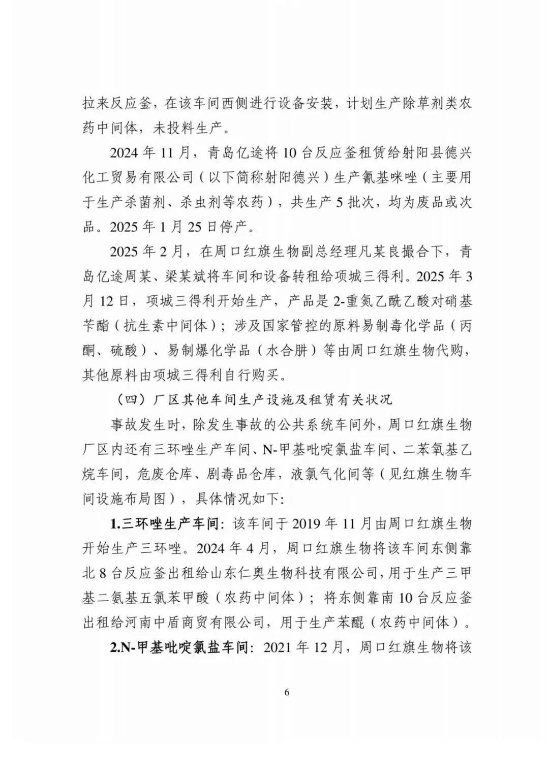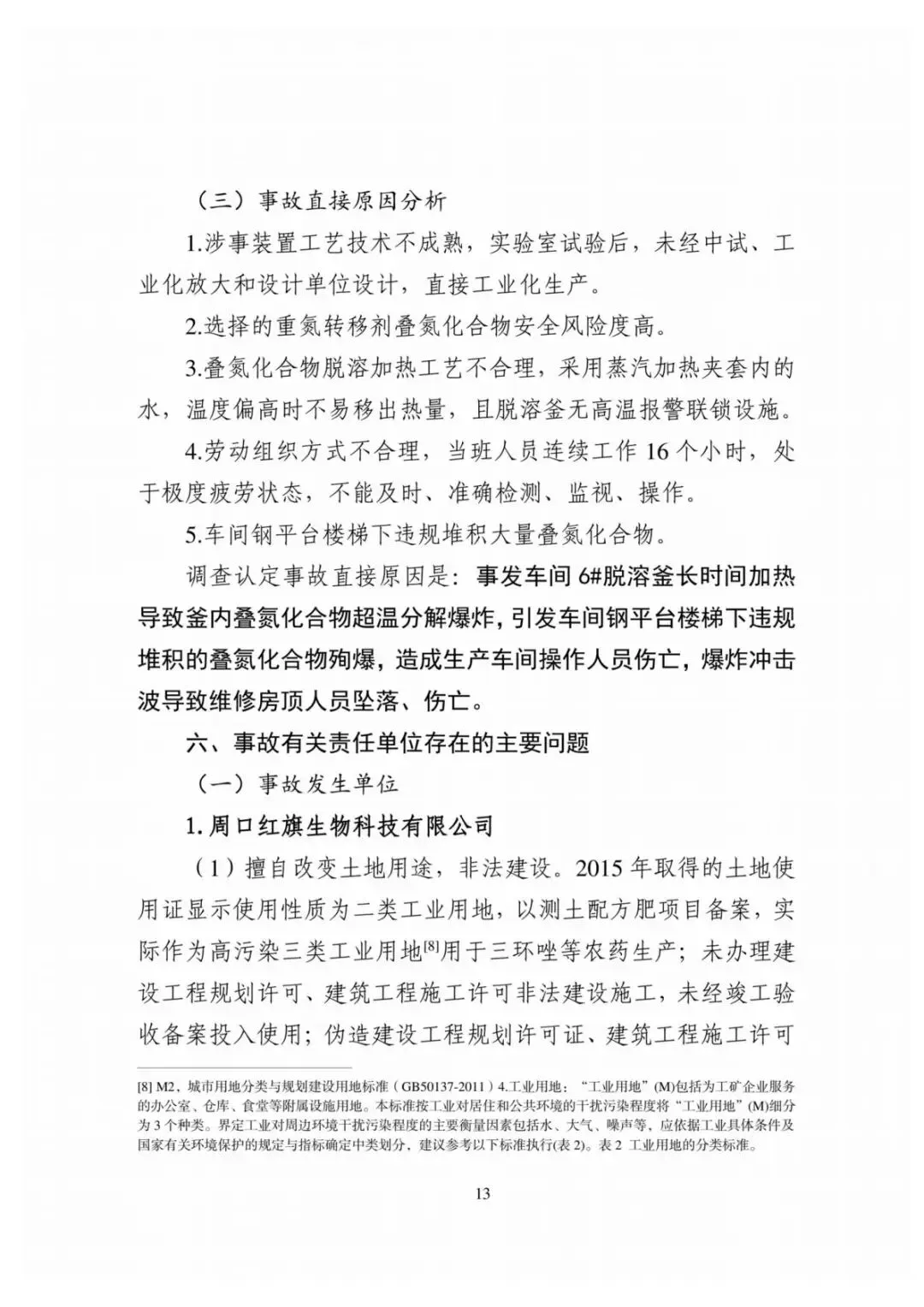2025年3月20日11时9分许,周口红旗生物厂区公共系统车间(北部西侧)6#脱溶釜蒸馏脱溶后,长时间加热导致釜内超温致使该釜发生爆炸,并引爆车间钢平台楼梯下储存的约800-900kg叠氮化合物,造成车间内当班人员5人死亡、1人受伤;房顶维修人员3人受伤,其中1人经抢救无效死亡。事故共造成6人死亡、3人受伤。
