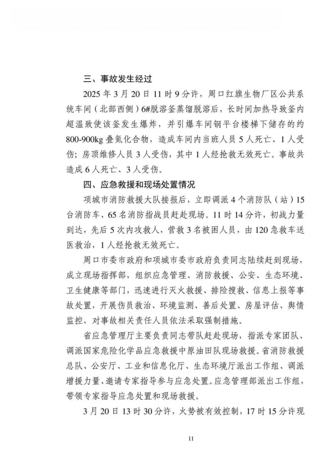 2025年3月20日11时9分许,河南周口市项城市周口红旗生物科技有限公司发生一起爆炸事故,造成6人死亡、3人受伤,直接经济损失1383万元