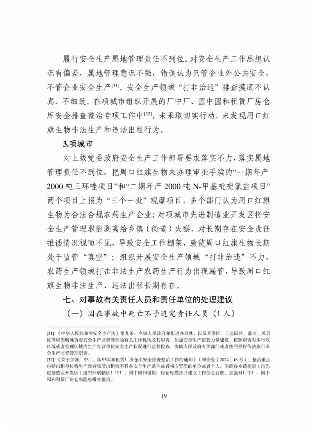 纪检监察部门依规依纪依法对事故中存在失职失责问题的项城市委、市政府等5家单位及项城市农业农村局、项城市工业和信息化局、项城市应急管理局、周口市生态环境局项城分局等部门31名党员及公职人员进行了严肃问责。