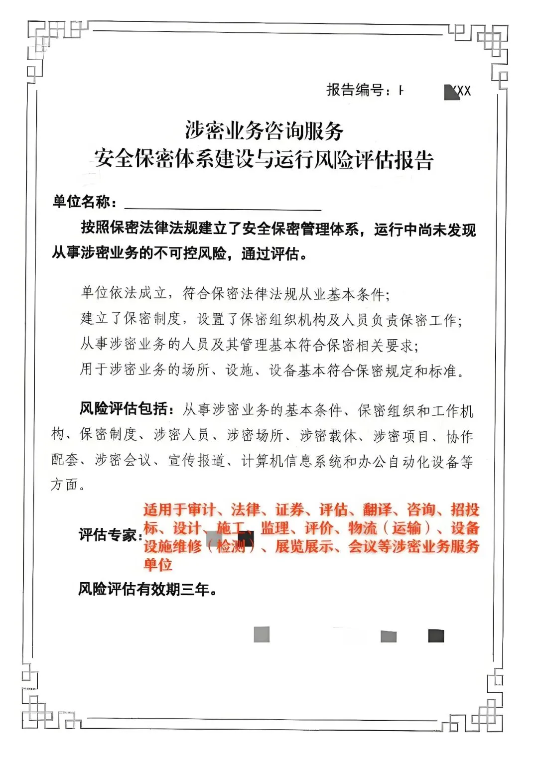合规经营的前提:根据《中华人民共和国保守国家秘密法》及相关配套法规,从事涉密业务咨询服务的企业,必须建立健全保密体系,并定期开展风险评估,出具评估报告,这是企业合法承接涉密业务、持续经营的基本前提。未办理评估报告的企业,属于违规经营,将被纳入监管重点名单。 业务承接的门槛:无论是军工单位、政务机关,还是其他涉密单位,在选择咨询服务供应商时,都会将涉密咨询保密风险评估报告作为核心审核指标之一。没有这份报告,企业将无法参与涉密咨询项目的招投标,无法承接相关业务,直接丧失核心市场竞争力。正如国防科工局相关规定所明确的,涉军企事业单位优先选择安全保密体系健全、通过第三方评估的服务单位,评估报告正是企业保密能力的“证明文件”。 风险防控的保障:涉密咨询服务过程中,存在人员泄密、载体泄密、技术泄密、流程泄密等多种风险,很多隐患隐藏在日常工作的细节中,仅凭内部自查很难发现。通过风险评估,企业可以借助第三方专业机构的力量,全面排查保密体系建设与运行中的薄弱环节,精准定位“安全漏洞”,并根据评估建议优化保密措施,防范泄密事件的发生,保护企业自身和服务对象的合法权益,维护国家安全和利益。