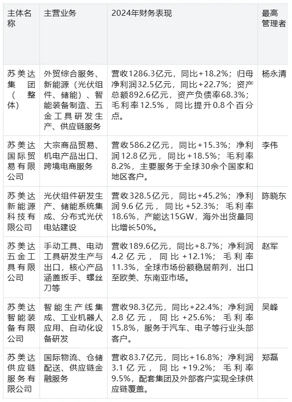 2024年苏美达集团实现营收1286.3亿元,同比增长18.2%;归母净利润32.5亿元,同比增长22.7%,核心子公司业务与财务表现如下: