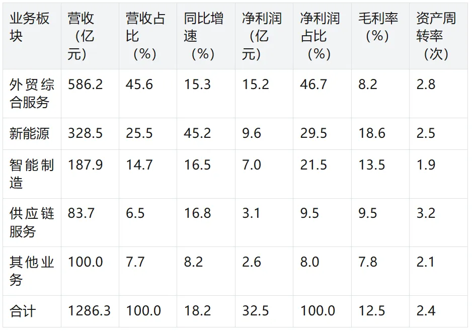 供应链服务板块:配套核心业务发展,提供物流、仓储、金融等增值服务,绑定集团内部客户同时拓展外部业务,贡献营收6.5%,业务增速高于传统外贸板块。