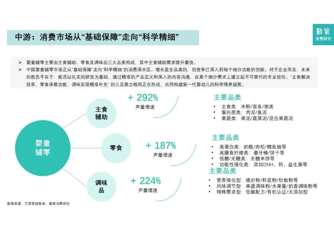 - 从“单一主食”转向“餐调协同”: 谷物类辅食(米粉/面条)是基本盘,但增长最快的是餐食类(果泥/肉泥)和调味类(猪肝粉/食用油),这反映了家长对营养精细化的需求。