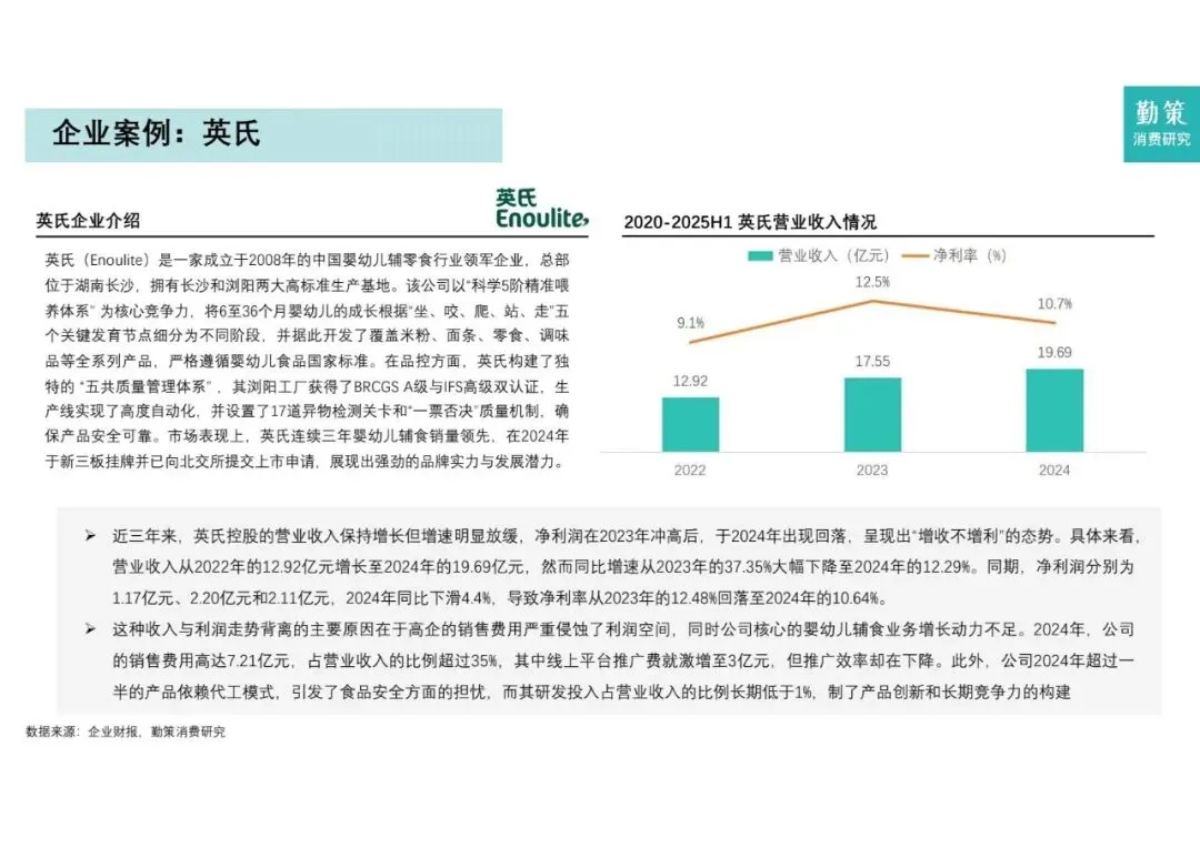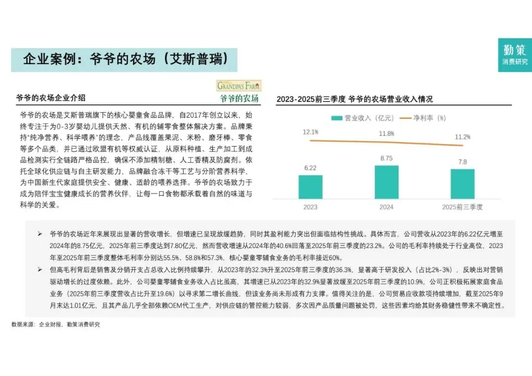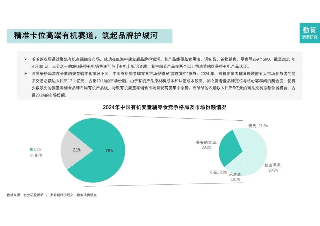 - 竞争格局: 市场高度分散,头部效应不明显。2024年前五大企业仅占14.2%的份额。目前英氏在总交易额上领先,而爷爷的农场在增长速度和有机细分赛道上占据优势。