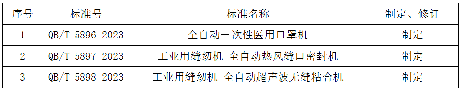 近日,工信部发布2023年第17号公告,批准412项行业标准,其中由全国缝制机械标准化技术委员会(SAC/TC152)归口的《全自动一次性医用口罩机》等3项行业标准正式批准发布(详见附表)。随着本批标准的发布,缝制机械行业现行有效标准已增至202项,行业标准体系进一步完善。