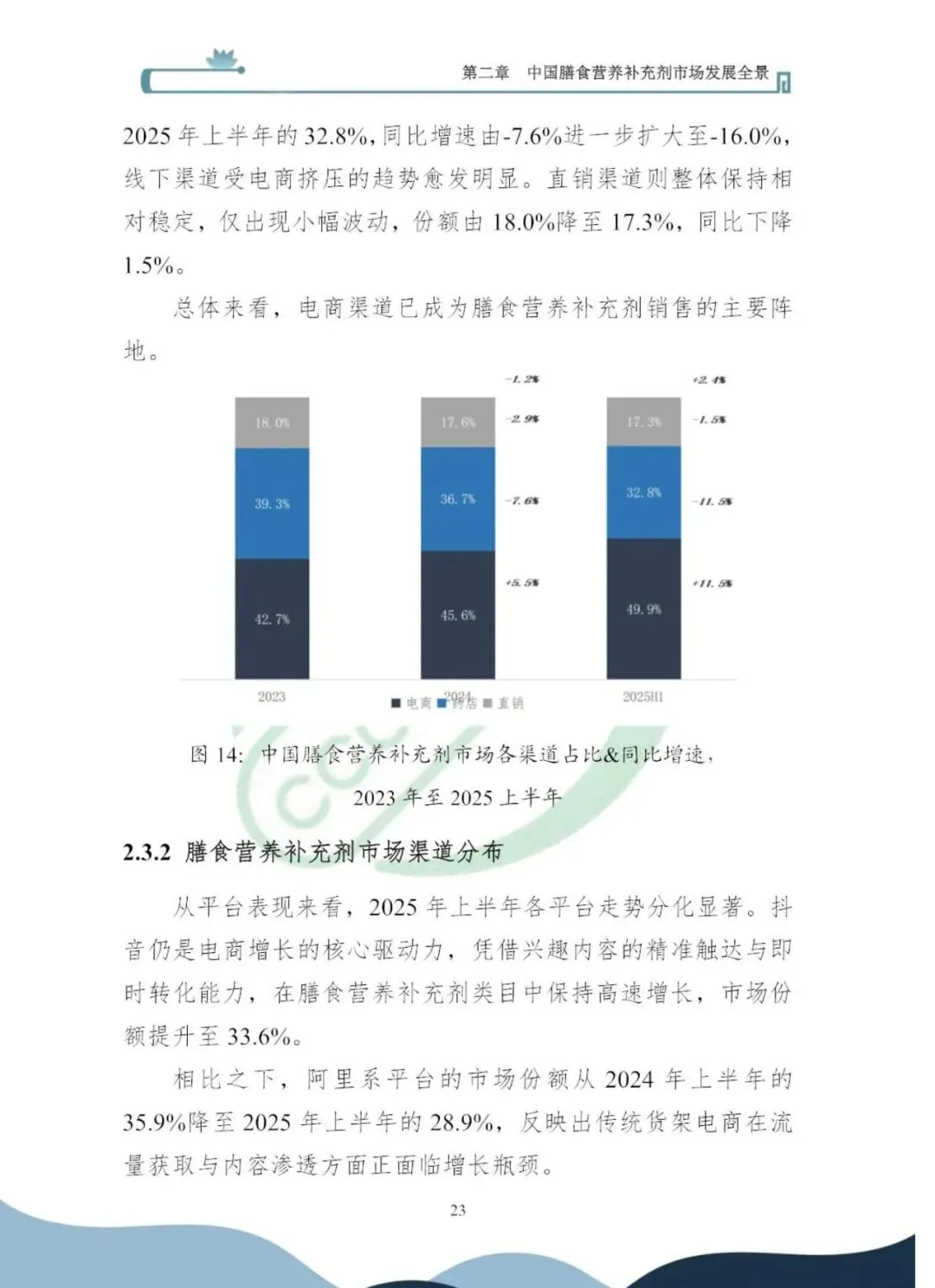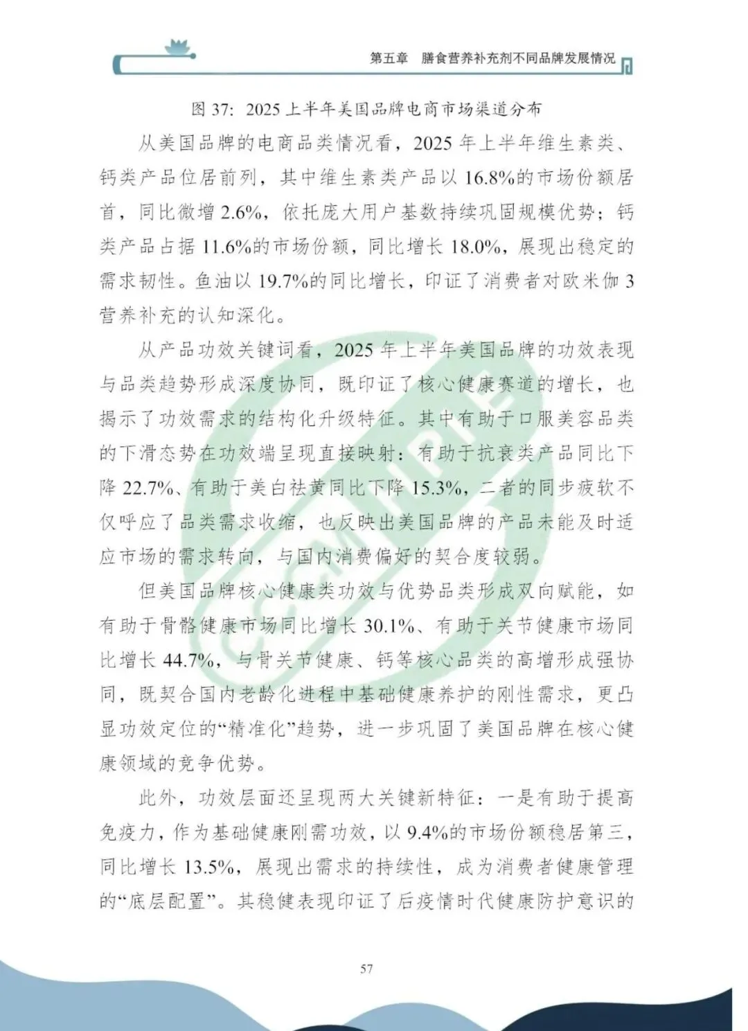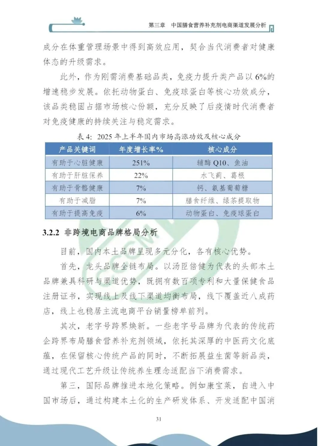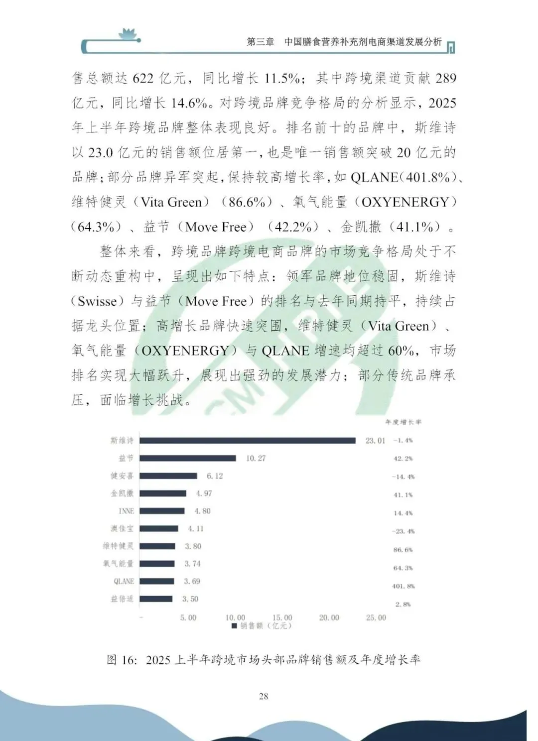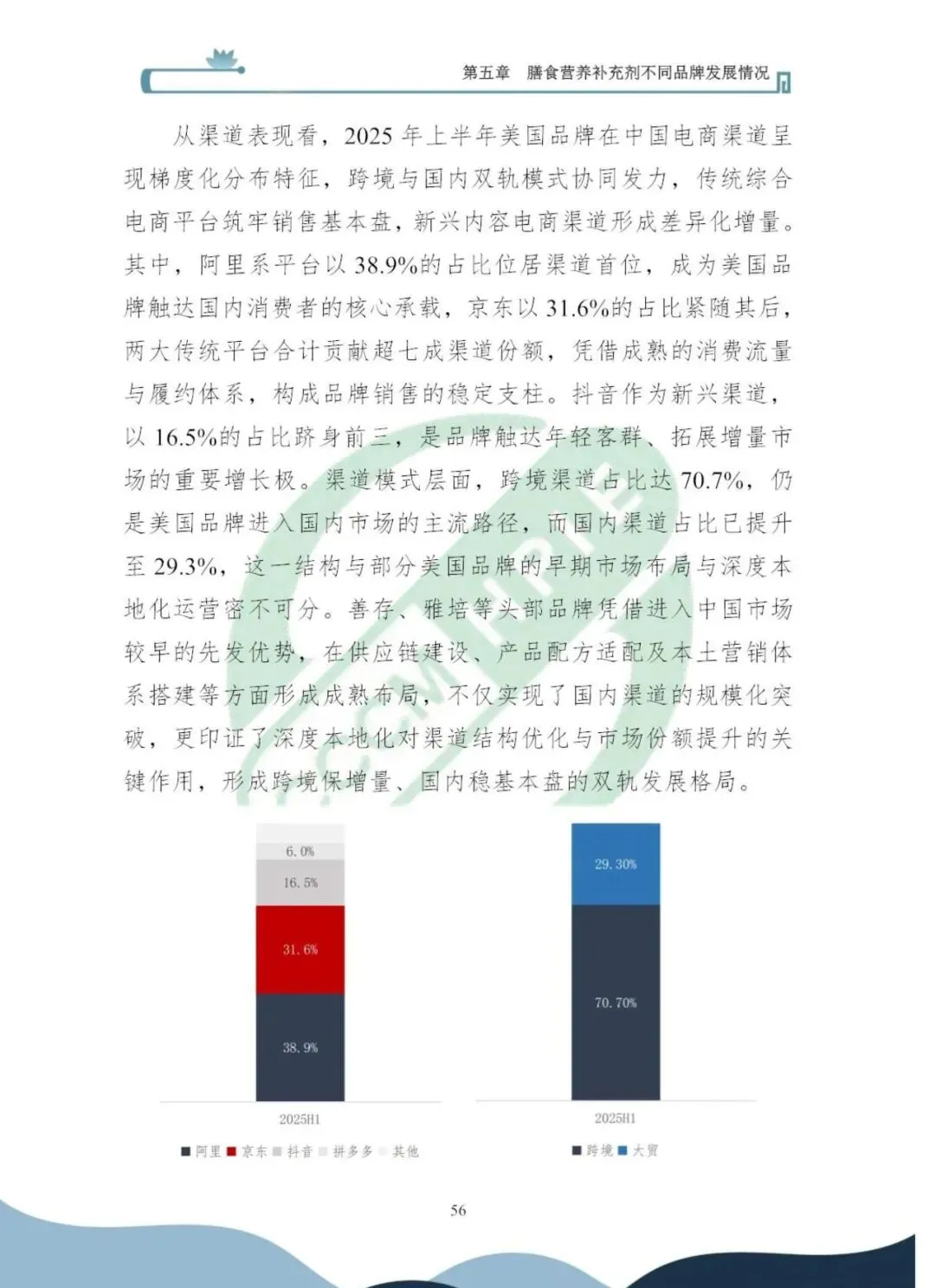 渠道变革正在深刻影响行业的竞争逻辑,电商已经成为驱动增长的核心引擎。2025 年上半年,中国膳食营养补充剂电商市场销售额达 622 亿元,同比增长 11.5%,抖音、京东、阿里三分天下,其中抖音增速高达 45.3%,内容电商通过短视频种草、直播带货的方式,让小众品牌也能快速触达消费者。跨境电商领域头部品牌优势稳固,但分化加速,部分专注细分功能赛道的品牌同比增速超过 60%,实现市场排名的显著跃升。