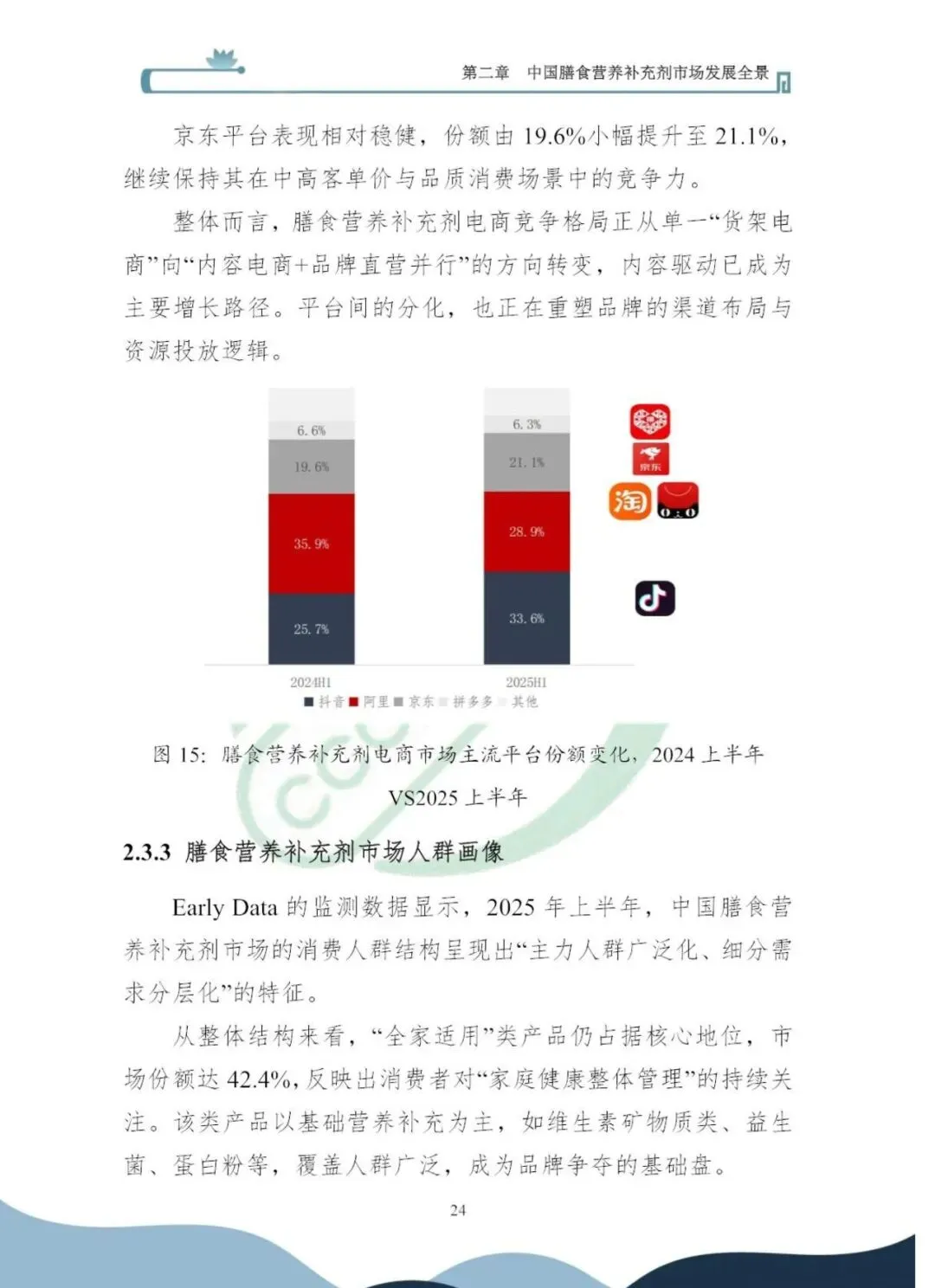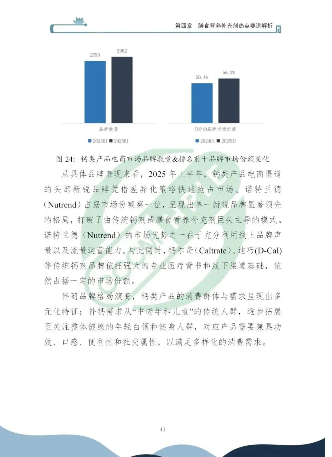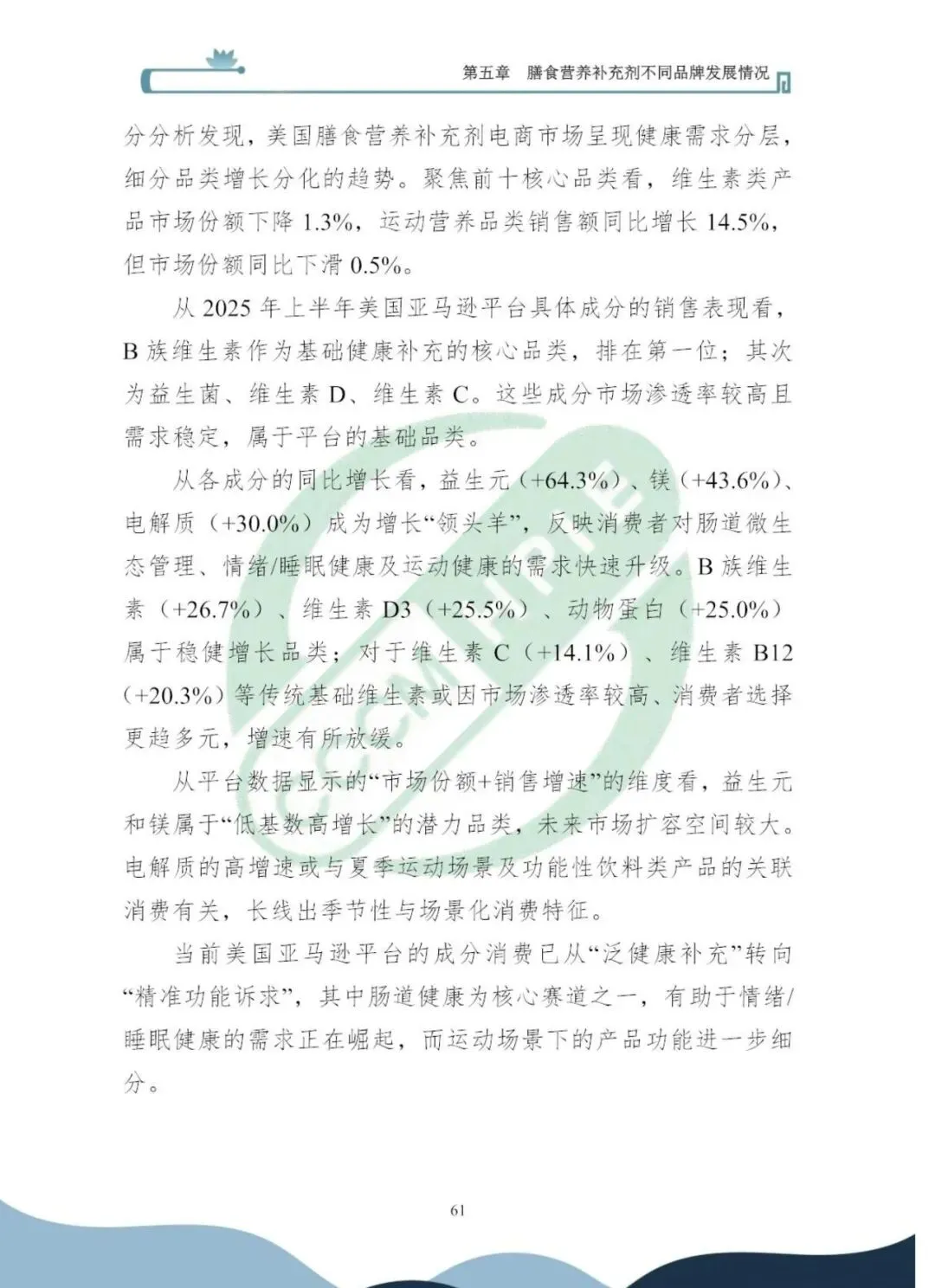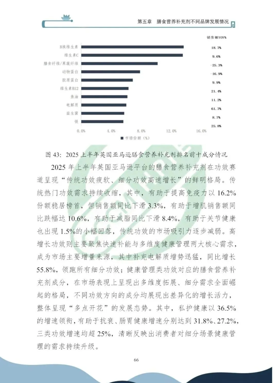 渠道变革正在深刻影响行业的竞争逻辑,电商已经成为驱动增长的核心引擎。2025 年上半年,中国膳食营养补充剂电商市场销售额达 622 亿元,同比增长 11.5%,抖音、京东、阿里三分天下,其中抖音增速高达 45.3%,内容电商通过短视频种草、直播带货的方式,让小众品牌也能快速触达消费者。跨境电商领域头部品牌优势稳固,但分化加速,部分专注细分功能赛道的品牌同比增速超过 60%,实现市场排名的显著跃升。