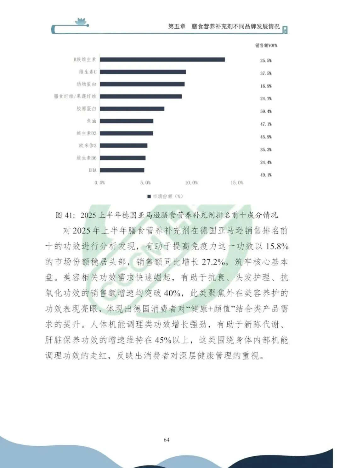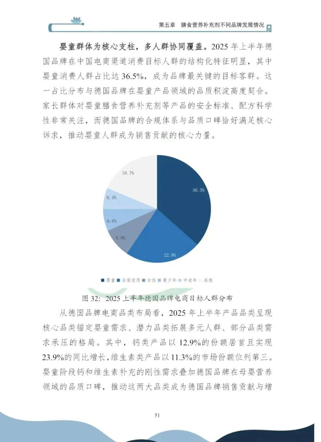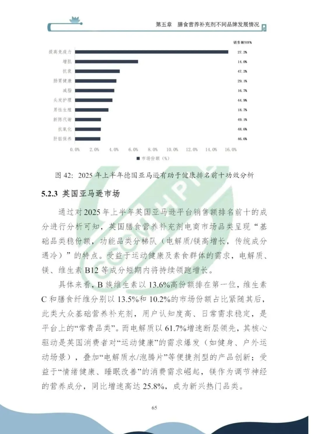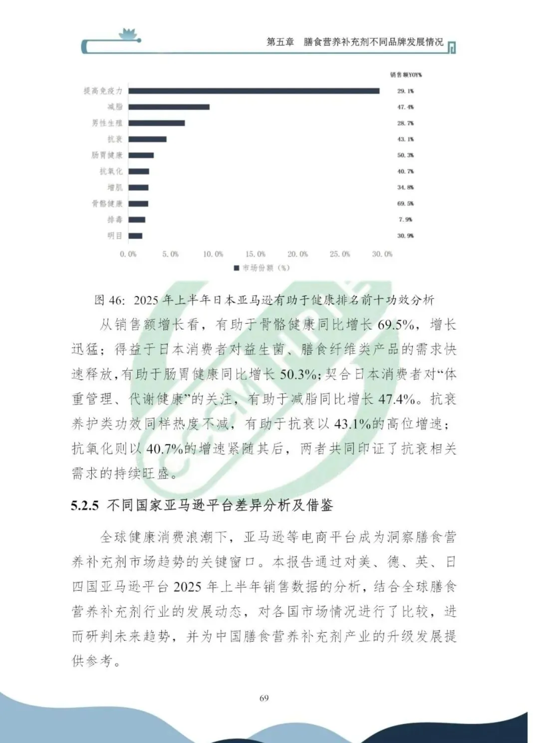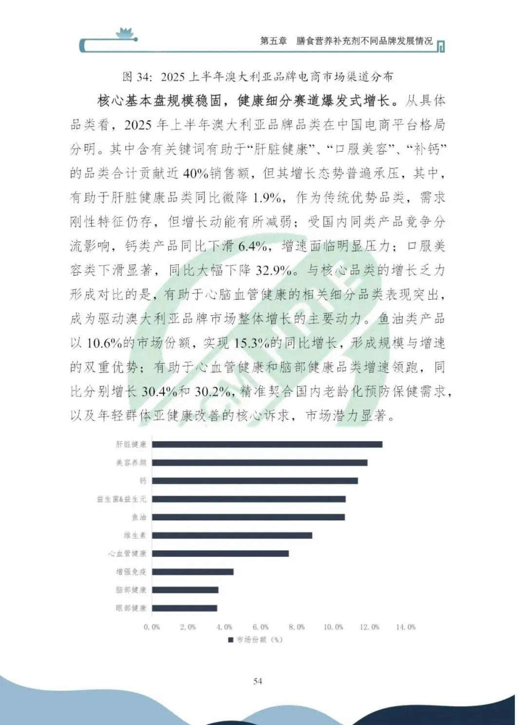 渠道变革正在深刻影响行业的竞争逻辑,电商已经成为驱动增长的核心引擎。2025 年上半年,中国膳食营养补充剂电商市场销售额达 622 亿元,同比增长 11.5%,抖音、京东、阿里三分天下,其中抖音增速高达 45.3%,内容电商通过短视频种草、直播带货的方式,让小众品牌也能快速触达消费者。跨境电商领域头部品牌优势稳固,但分化加速,部分专注细分功能赛道的品牌同比增速超过 60%,实现市场排名的显著跃升。