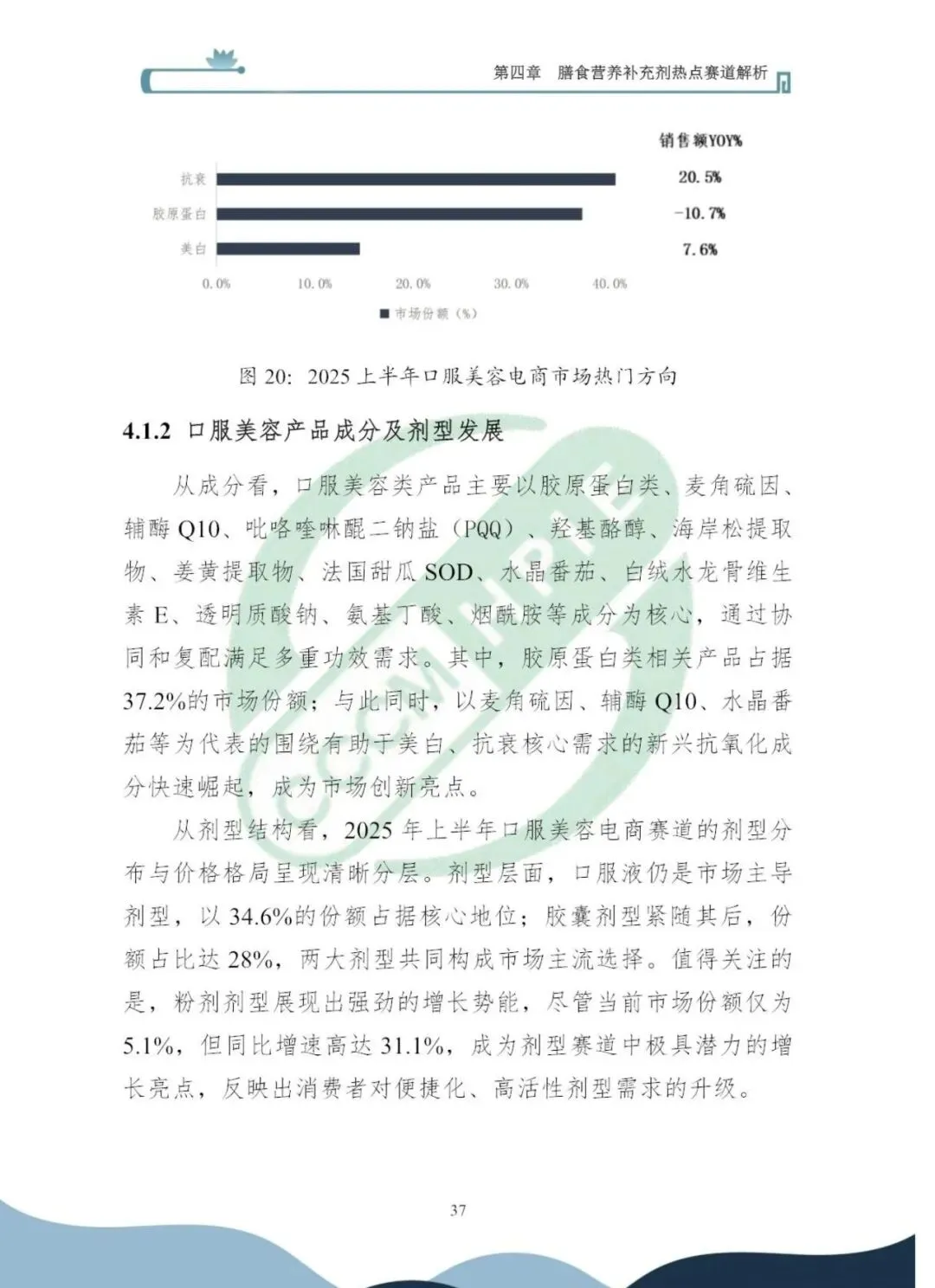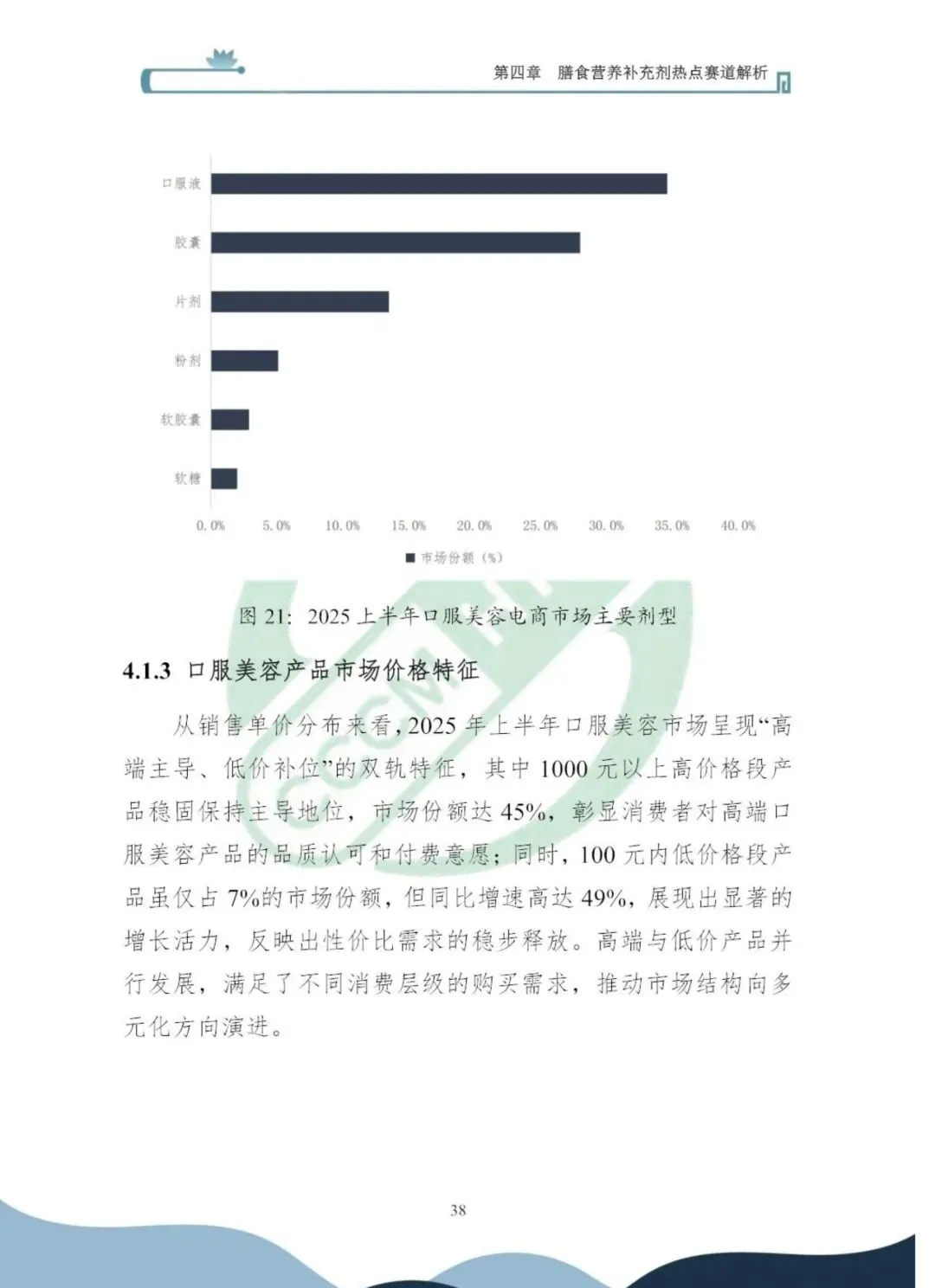 女性群体的 “内外兼修” 需求催生了口服美容赛道的爆发,2025 年上半年电商销售额达 74.8 亿元,抗衰类产品增速超 20%。胶原蛋白、麦角硫因、辅酶 Q10 成为热门成分,口服液和胶囊剂型最受欢迎,价格呈现两极分化:1000 元以上高端产品占比 45%,百元内低价产品增速却近 50%,无论是追求高端成分还是性价比,都能找到适配选项。