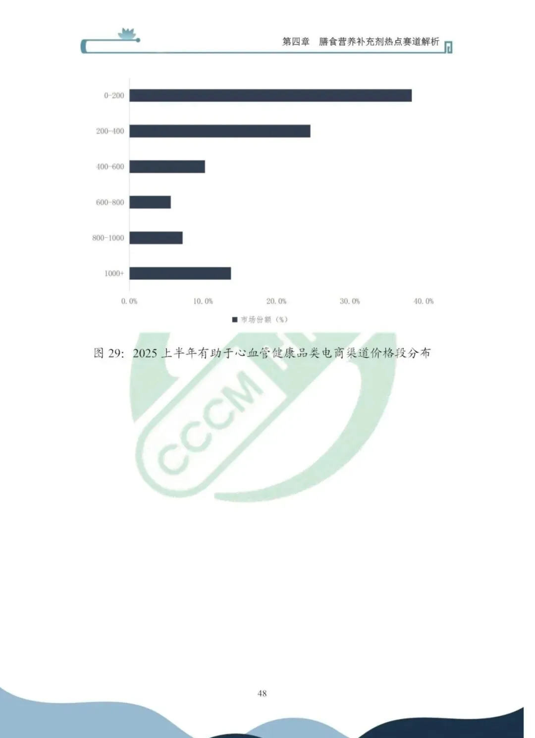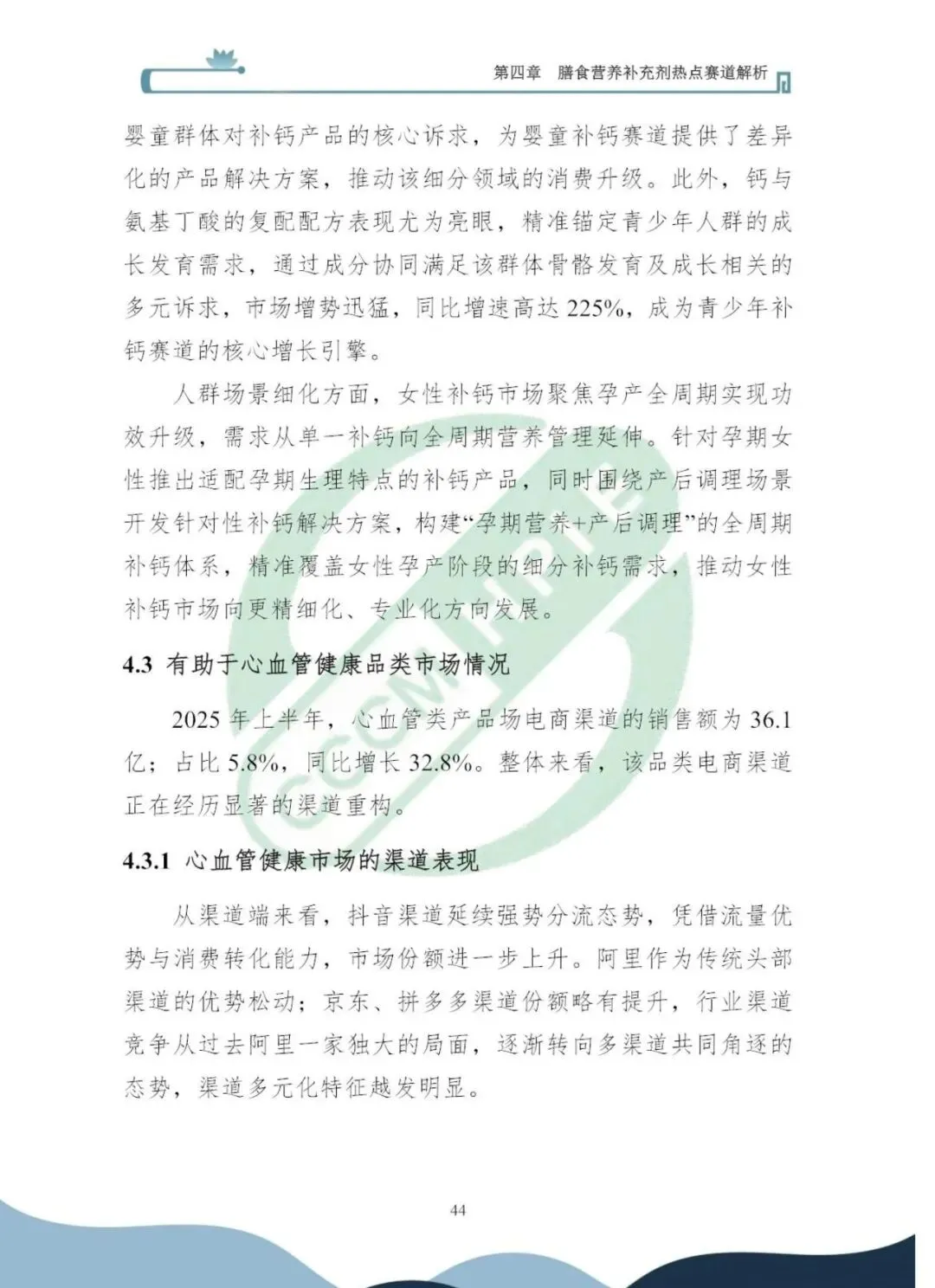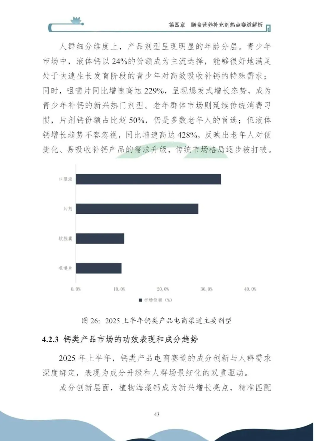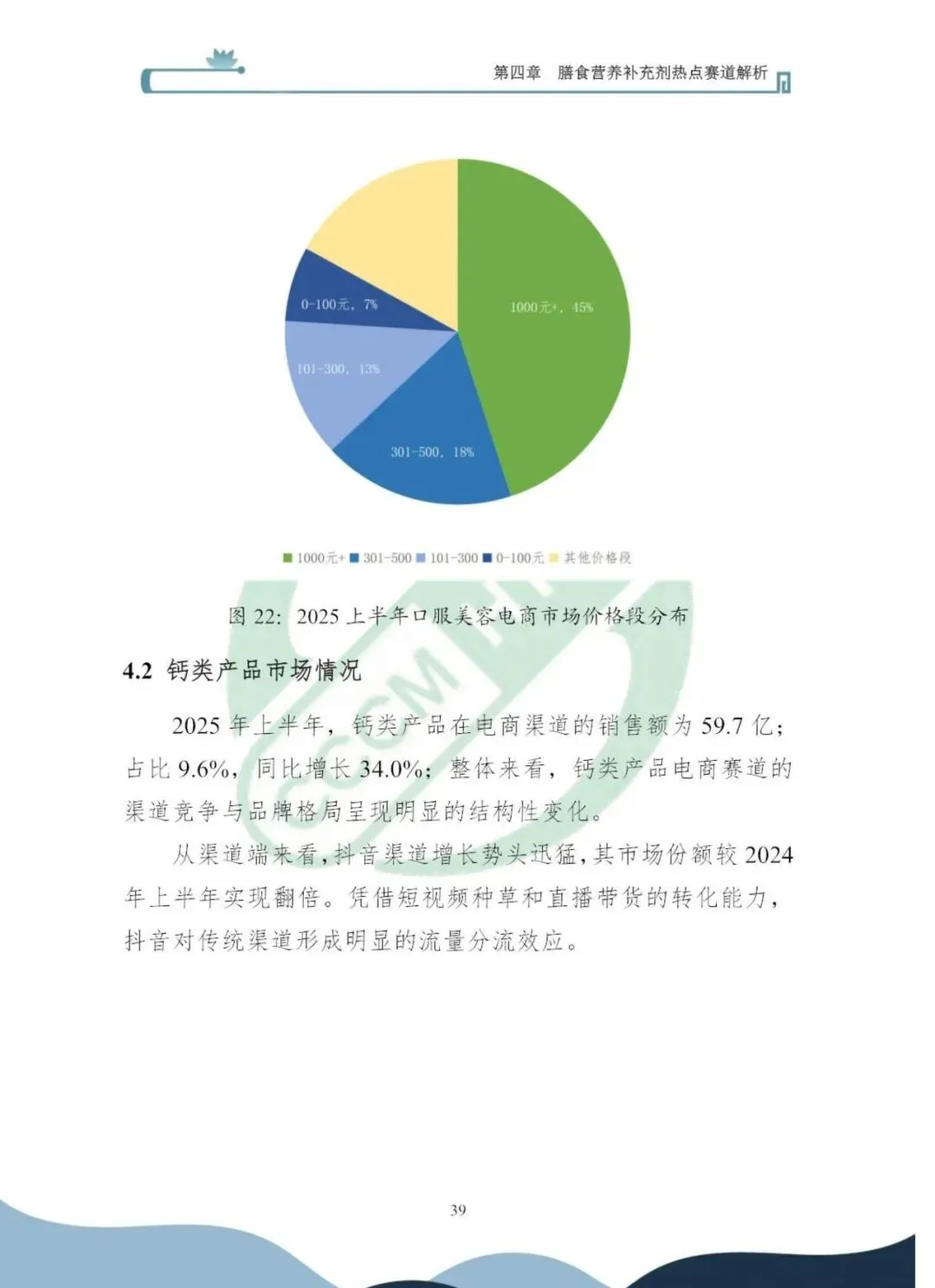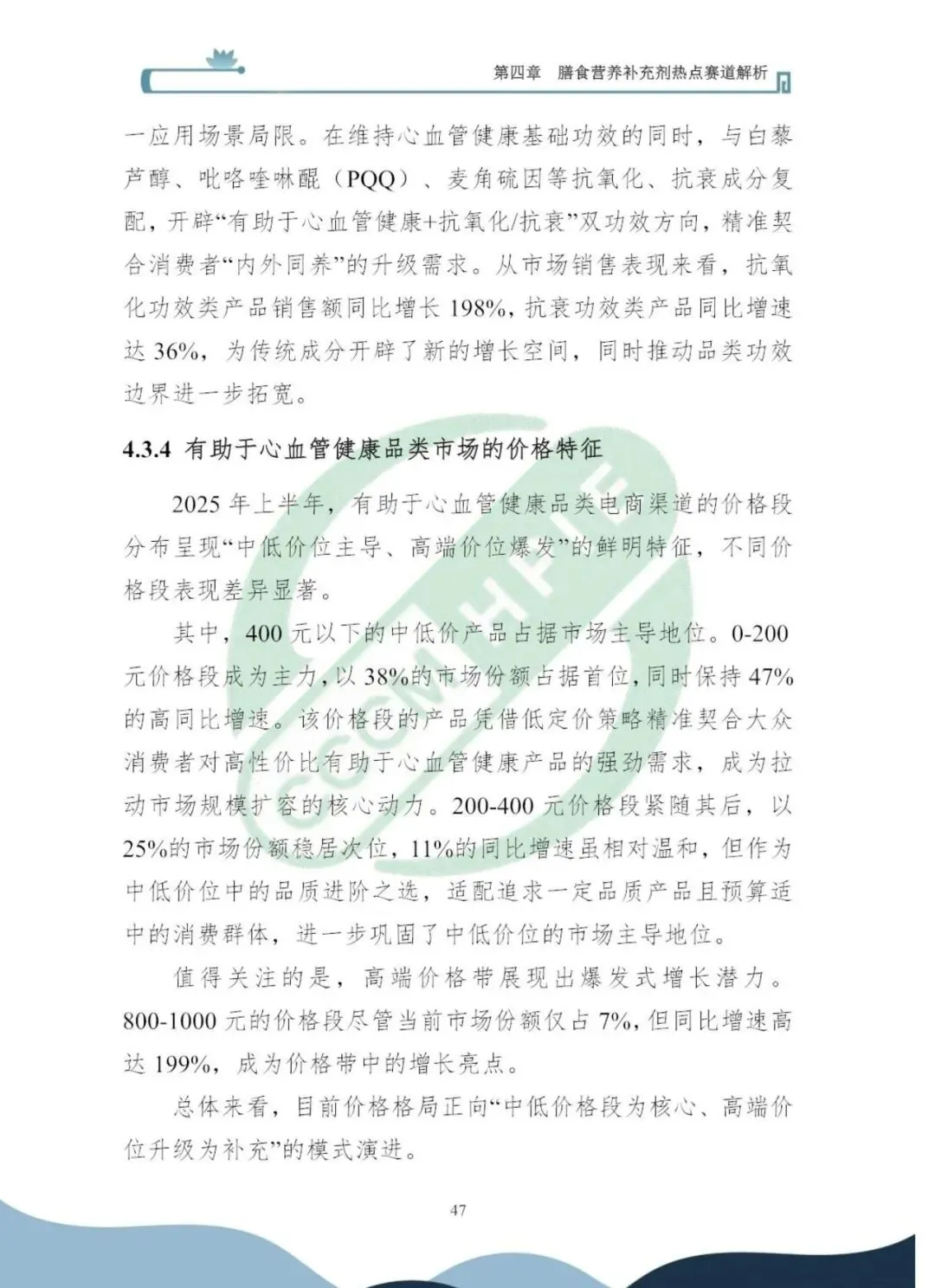 银发经济的崛起则让骨骼、关节、心脑健康类产品成为刚需。钙类产品不再是 “老年专属”,2025 年上半年电商销售额 59.7 亿元,同比增长 34%,液体钙增速超 96%,咀嚼片增长 153%,青少年和健身人群的加入让这个传统品类焕发新生。心血管健康赛道同样火热,上半年电商销售额 36.1 亿元,增速达 32.8%,磷虾油强调 “南极纯净”,辅酶 Q10 跨界搭配抗氧化成分,就连小众成分水蛭素增速都达 188%,价格上 0至400 元产品主导市场,800至1000 元高端价位增速却近 200%,消费升级趋势明显。
