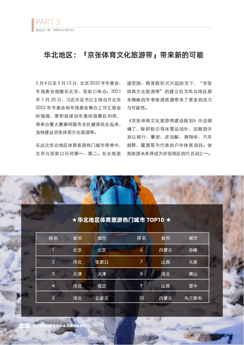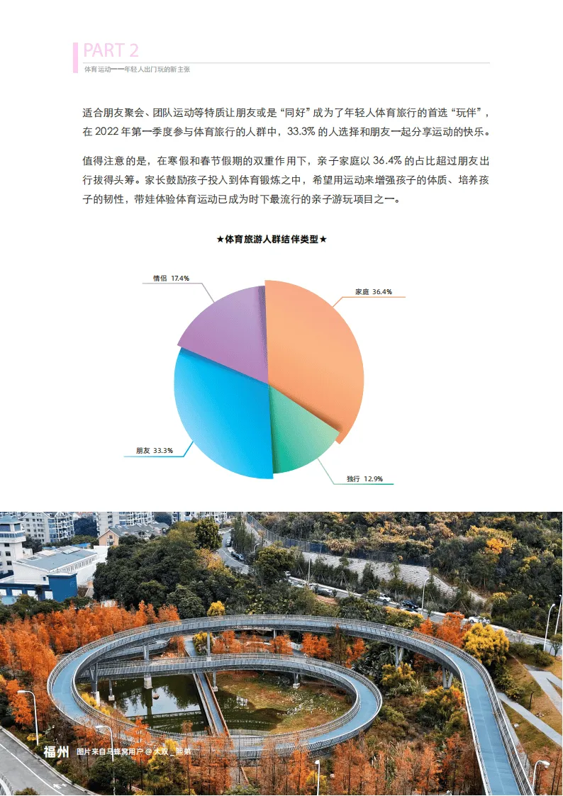 体育旅游是以体育资源和设施为基础,以体育运动项目为核心,涵盖参与体验和参观游览等形式,满足人们健康娱乐与休闲需求的经济活动。后疫情时代,人们对健康的重视程度不断提升,从单纯观赏赛事到亲身参与竞技,从极限运动到休闲健身,体育旅游凭借丰富的玩法覆盖各年龄层与兴趣圈层,成为年轻人度过周末及假期的重要方式。