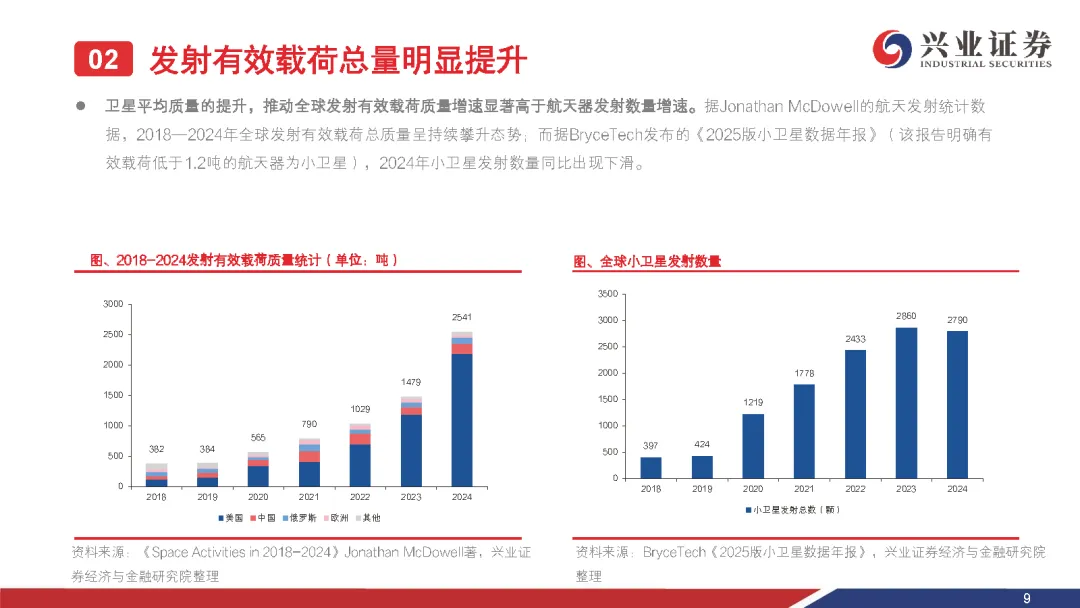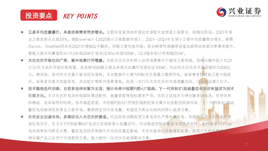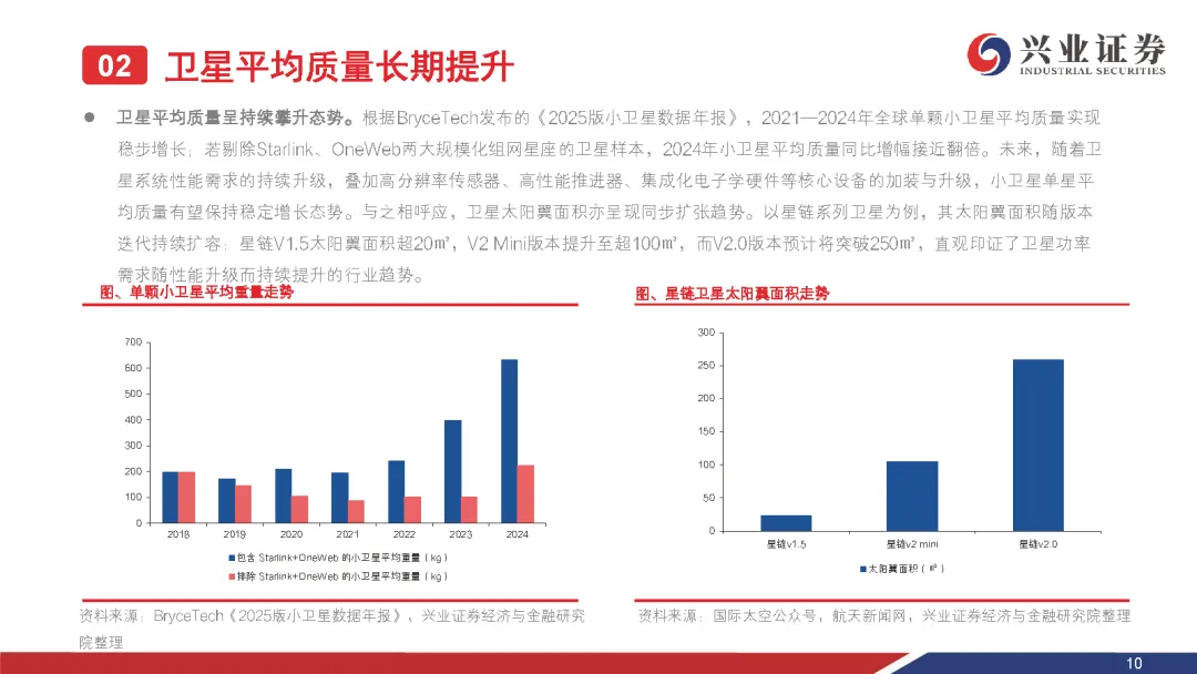 1. 卫星平均质量攀升,单星功率需求同步增长。2. 太空光伏市场空间广阔,新兴场景打开增量。