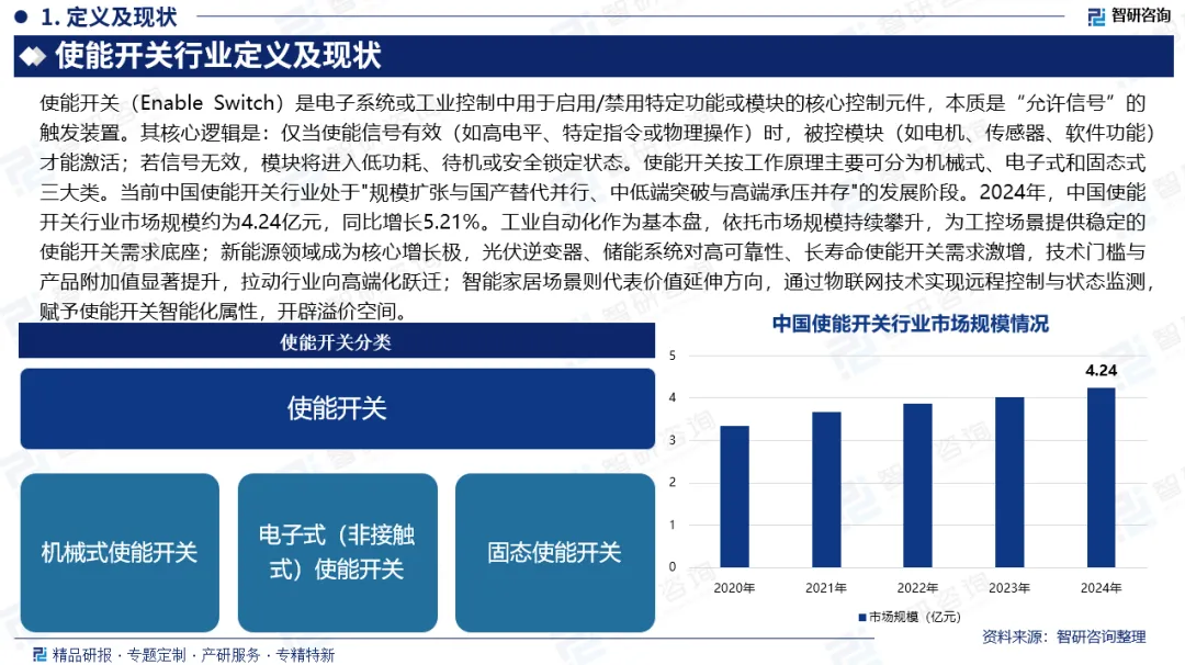 市场规模:当前中国使能开关行业处于"规模扩张与国产替代并行、中低端突破与高端承压并存"的发展阶段。2024年,中国使能开关行业市场规模约为4.24亿元,同比增长5.21%。工业自动化作为基本盘,依托市场规模持续攀升,为工控场景提供稳定的使能开关需求底座;新能源领域成为核心增长极,光伏逆变器、储能系统对高可靠性、长寿命使能开关需求激增,技术门槛与产品附加值显著提升,拉动行业向高端化跃迁;智能家居场景则代表价值延伸方向,通过物联网技术实现远程控制与状态监测,赋予使能开关智能化属性,开辟溢价空间。