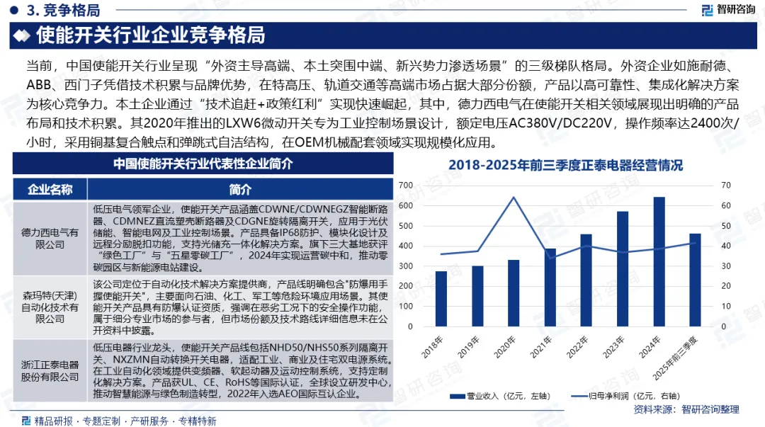 竞争情况:当前,中国使能开关行业呈现“外资主导高端、本土突围中端、新兴势力渗透场景”的三级梯队格局。外资企业如施耐德、ABB、西门子凭借技术积累与品牌优势,在特高压、轨道交通等高端市场占据大部分份额,产品以高可靠性、集成化解决方案为核心竞争力。本土企业通过“技术追赶+政策红利”实现快速崛起,其中,德力西电气在使能开关相关领域展现出明确的产品布局和技术积累。其2020年推出的LXW6微动开关专为工业控制场景设计,额定电压AC380V/DC220V,操作频率达2400次/小时,采用铜基复合触点和弹跳式自洁结构,在OEM机械配套领域实现规模化应用。