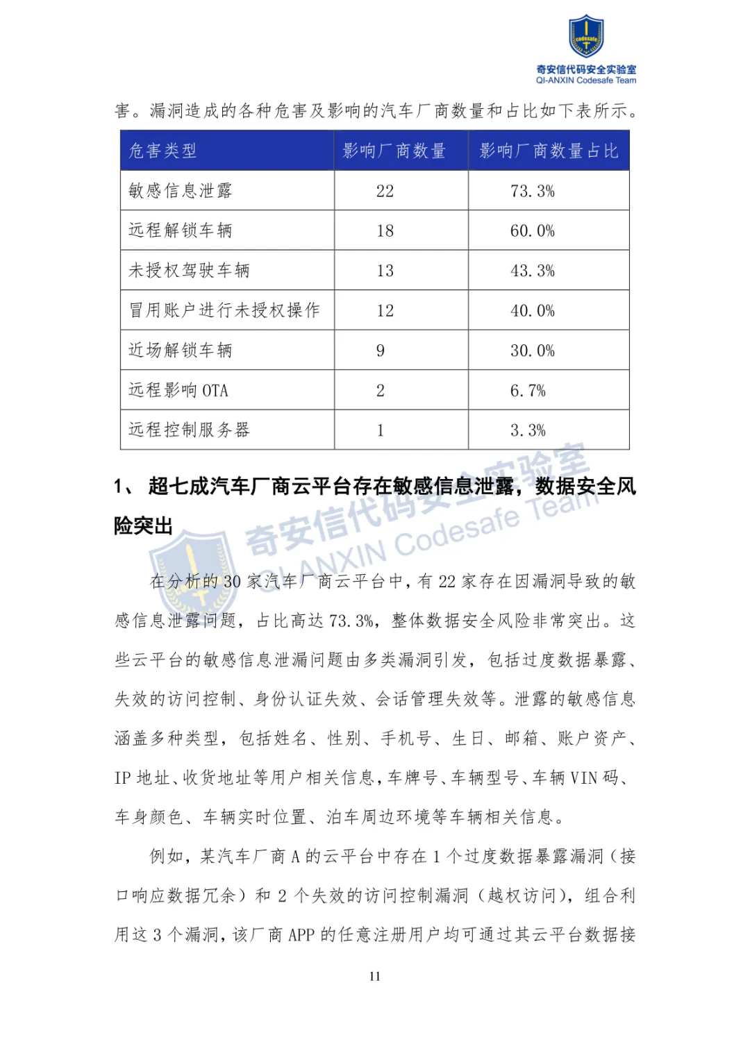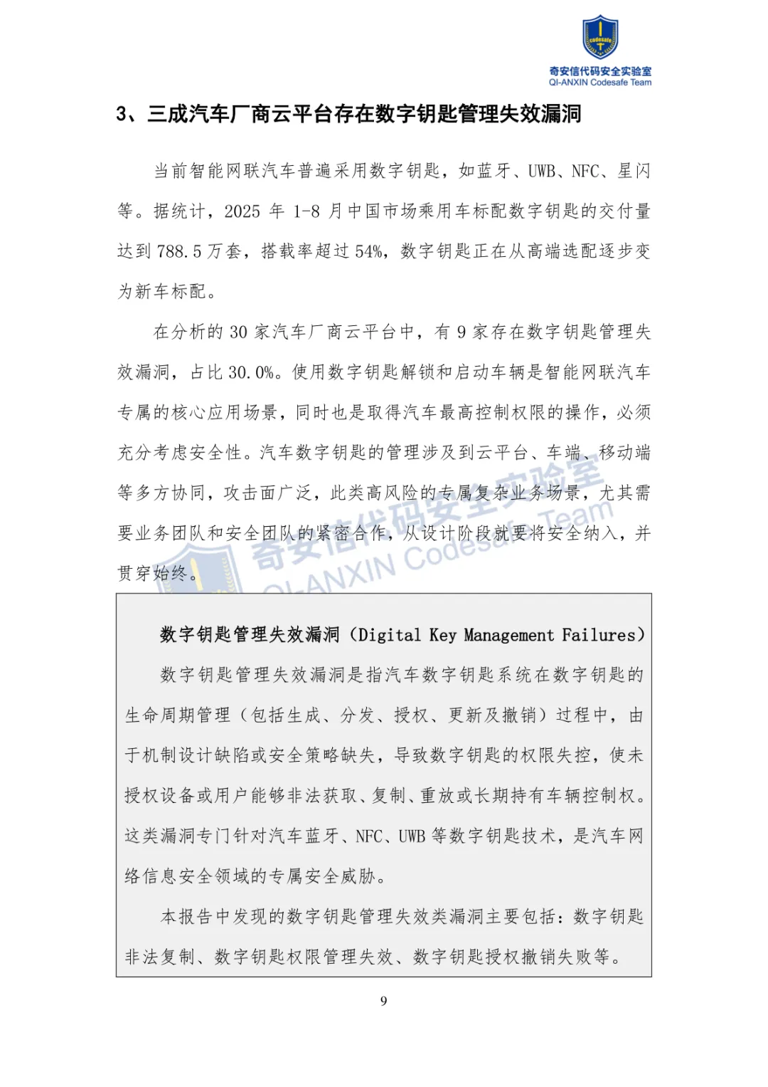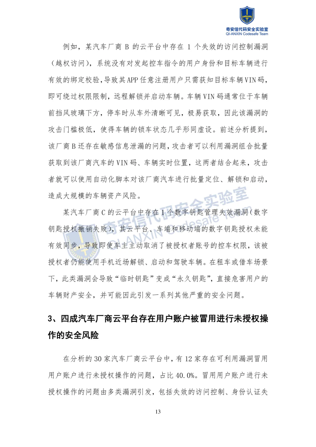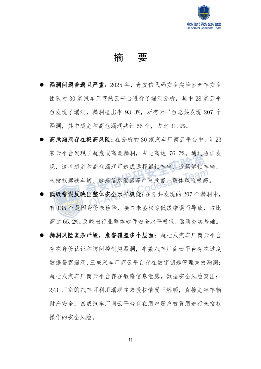 导读:报告对 30 家汽车厂商云平台的漏洞分析显示,行业安全问题极为严峻。漏洞检出率达 93.3%,共发现 207 个漏洞,其中超危和高危漏洞占比 31.9%,76.7% 的云平台存在此类高风险漏洞。漏洞成因多为基础安全缺失,65.2% 的漏洞源于身份未检验、接口未鉴权等低级错误。主要漏洞类型包括身份认证和访问控制类、过度数据暴露、数字钥匙管理失效等,超七成云平台受身份认证和访问控制类漏洞影响。这些漏洞可导致远程解锁、未授权驾驶、敏感信息泄露等严重危害,66.7% 的厂商汽车存在未授权解锁风险,73.3% 的云平台存在敏感信息泄露问题。报告指出行业存在系统性安全缺陷,安全架构设计缺位、编码规范缺失。建议厂商将网络安全上升为战略层面,推行安全开发生命周期,强化软件供应链管控,构建车云协同的主动免疫体系,通过零信任架构、统一密钥管理等措施筑牢安全防线。