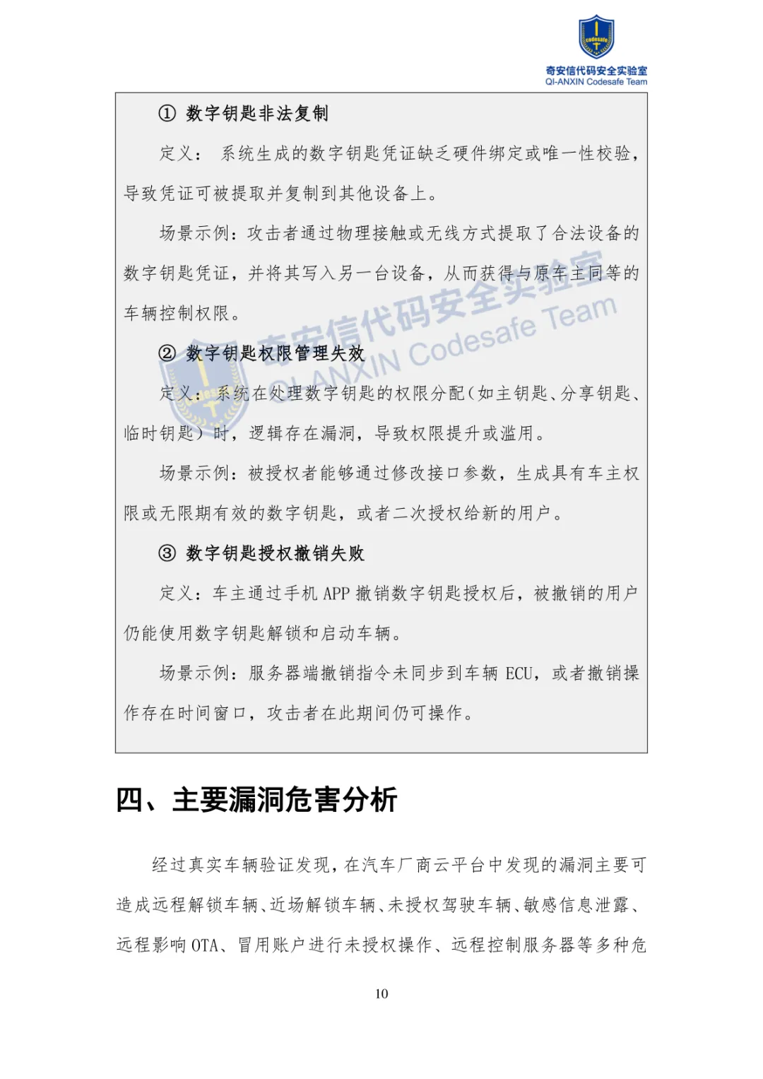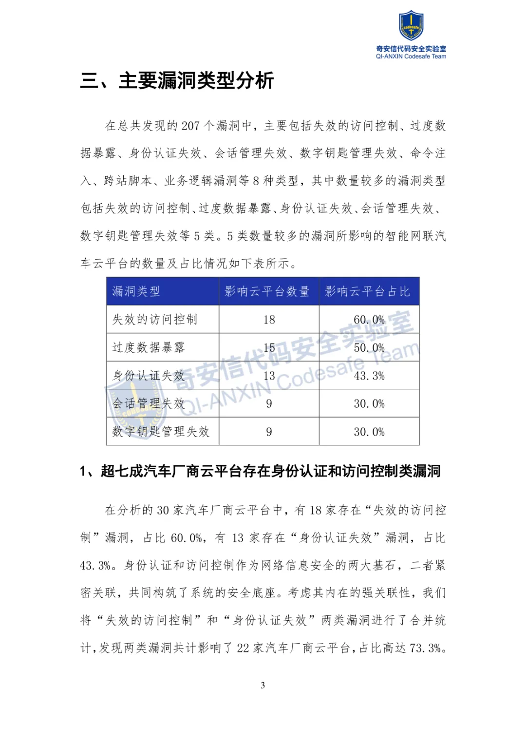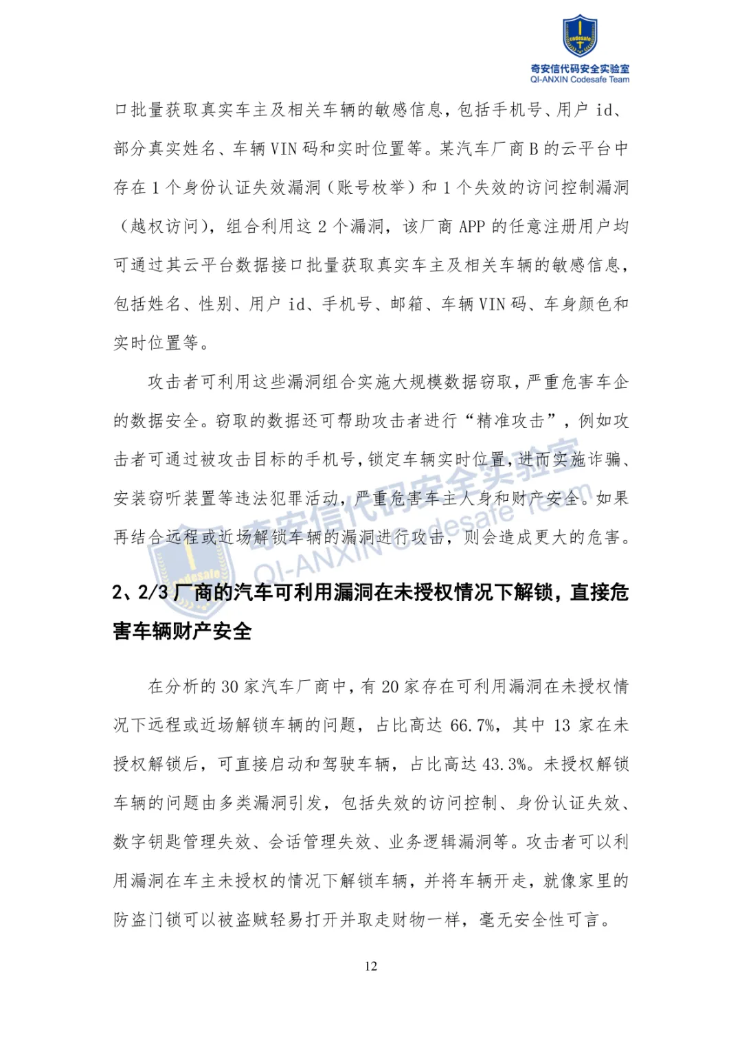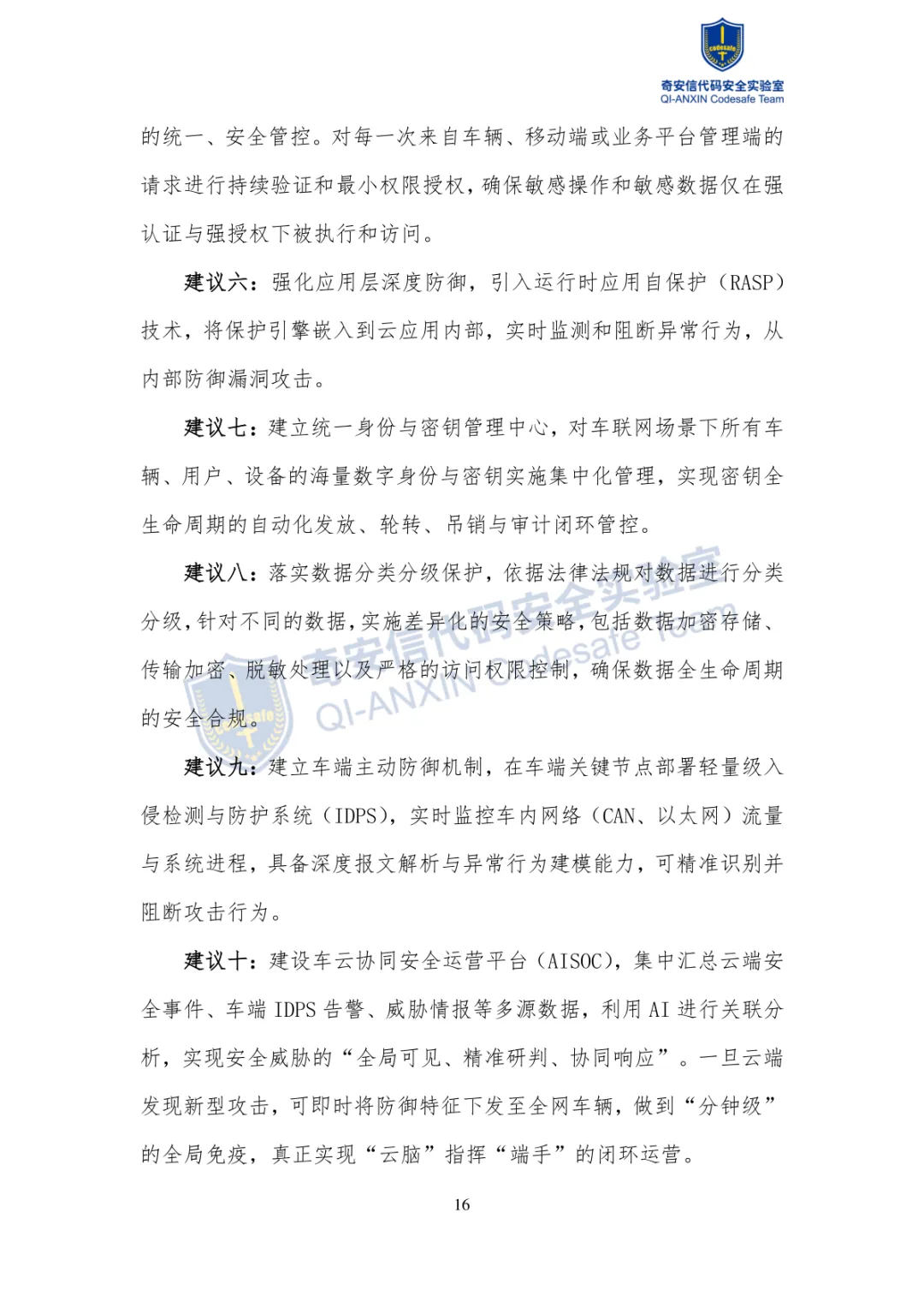 导读:报告对 30 家汽车厂商云平台的漏洞分析显示,行业安全问题极为严峻。漏洞检出率达 93.3%,共发现 207 个漏洞,其中超危和高危漏洞占比 31.9%,76.7% 的云平台存在此类高风险漏洞。漏洞成因多为基础安全缺失,65.2% 的漏洞源于身份未检验、接口未鉴权等低级错误。主要漏洞类型包括身份认证和访问控制类、过度数据暴露、数字钥匙管理失效等,超七成云平台受身份认证和访问控制类漏洞影响。这些漏洞可导致远程解锁、未授权驾驶、敏感信息泄露等严重危害,66.7% 的厂商汽车存在未授权解锁风险,73.3% 的云平台存在敏感信息泄露问题。报告指出行业存在系统性安全缺陷,安全架构设计缺位、编码规范缺失。建议厂商将网络安全上升为战略层面,推行安全开发生命周期,强化软件供应链管控,构建车云协同的主动免疫体系,通过零信任架构、统一密钥管理等措施筑牢安全防线。