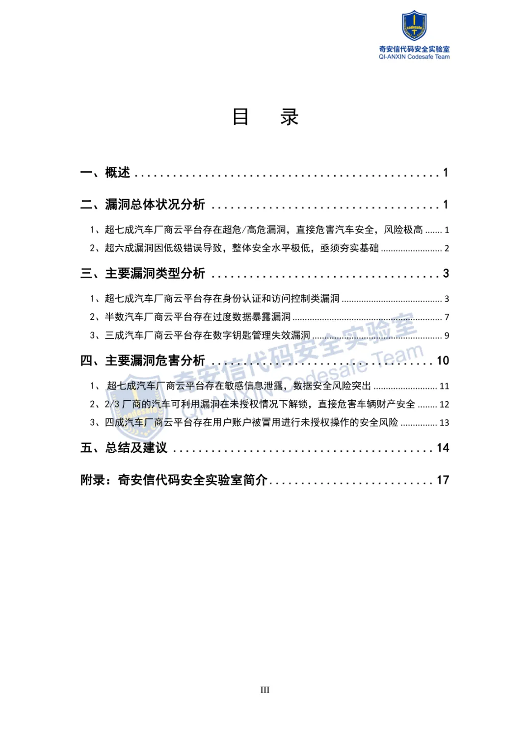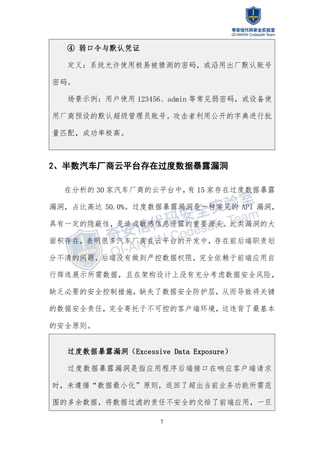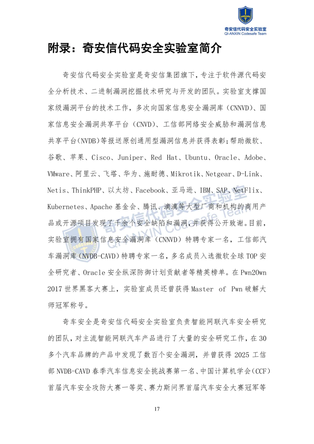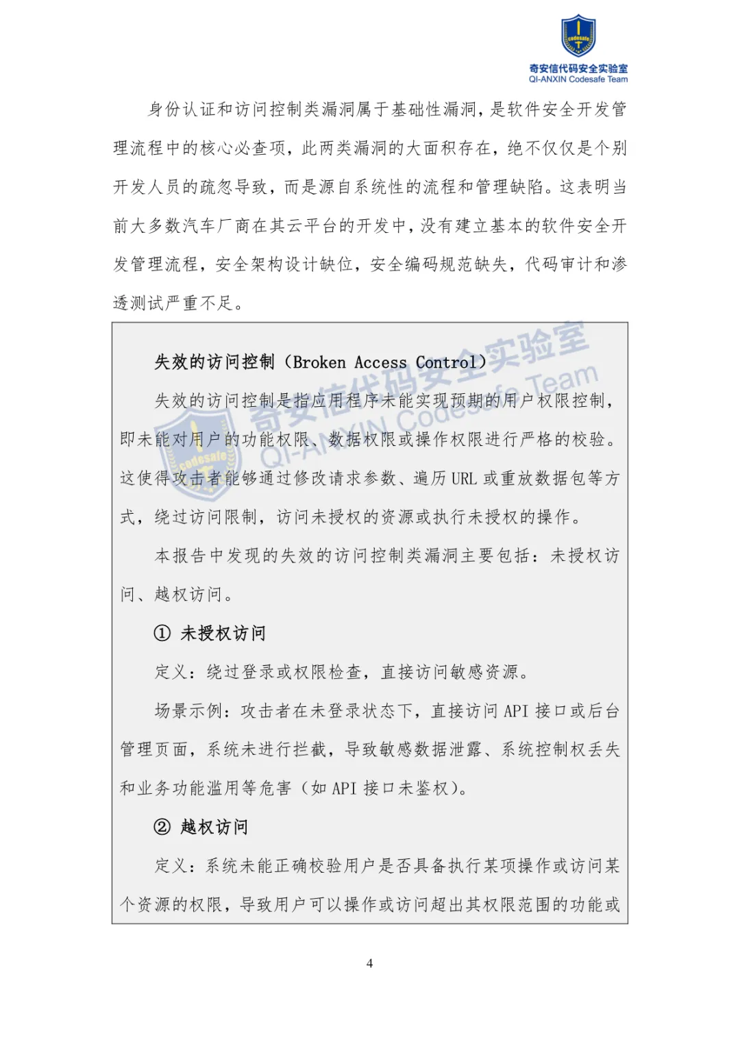 导读:报告对 30 家汽车厂商云平台的漏洞分析显示,行业安全问题极为严峻。漏洞检出率达 93.3%,共发现 207 个漏洞,其中超危和高危漏洞占比 31.9%,76.7% 的云平台存在此类高风险漏洞。漏洞成因多为基础安全缺失,65.2% 的漏洞源于身份未检验、接口未鉴权等低级错误。主要漏洞类型包括身份认证和访问控制类、过度数据暴露、数字钥匙管理失效等,超七成云平台受身份认证和访问控制类漏洞影响。这些漏洞可导致远程解锁、未授权驾驶、敏感信息泄露等严重危害,66.7% 的厂商汽车存在未授权解锁风险,73.3% 的云平台存在敏感信息泄露问题。报告指出行业存在系统性安全缺陷,安全架构设计缺位、编码规范缺失。建议厂商将网络安全上升为战略层面,推行安全开发生命周期,强化软件供应链管控,构建车云协同的主动免疫体系,通过零信任架构、统一密钥管理等措施筑牢安全防线。