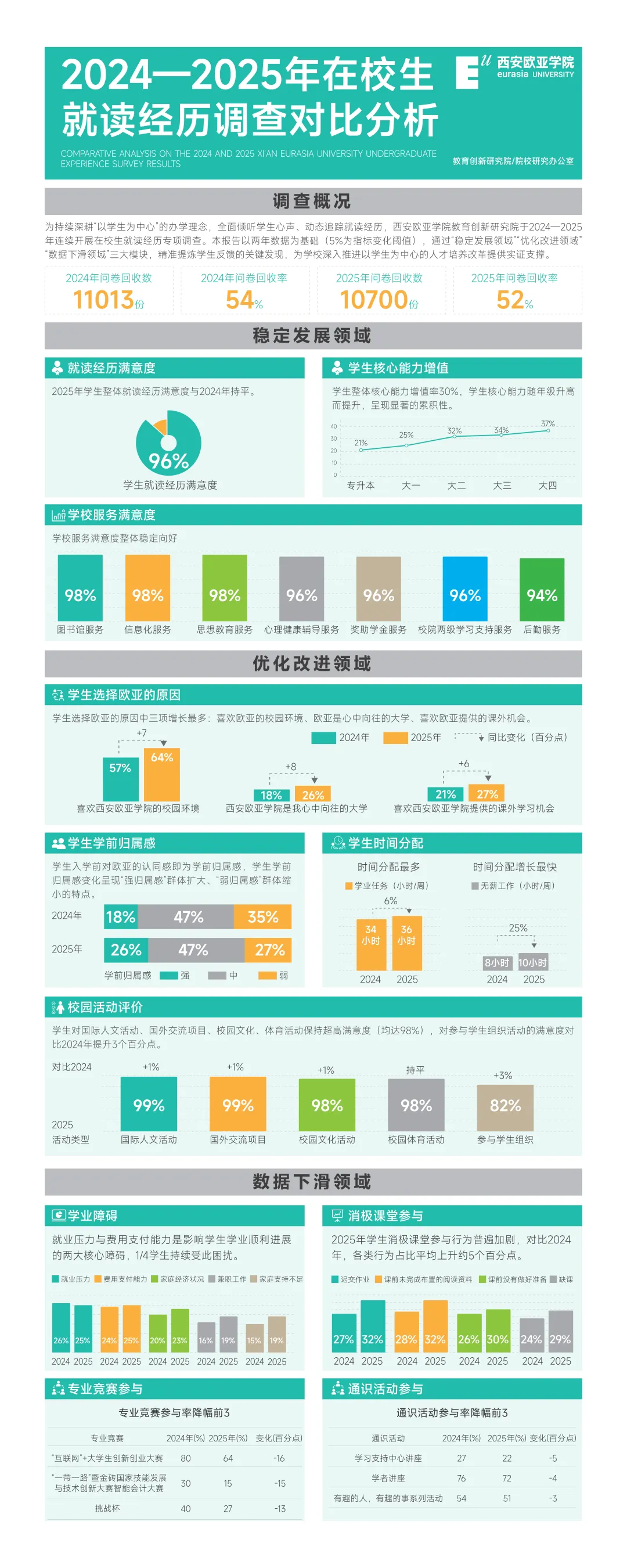 本报告摘要以2024年,2025年在校生就读经历调查数据为基础(5%为指标变化阈值),通过"稳定发展领域""优化改进领域""数据下滑领域"三大模块,展示学生就读经历变化情况,分类反馈学生意见,为学校推进以学生为中心的人才培养改革提供实证支撑,完整报告后续发出。