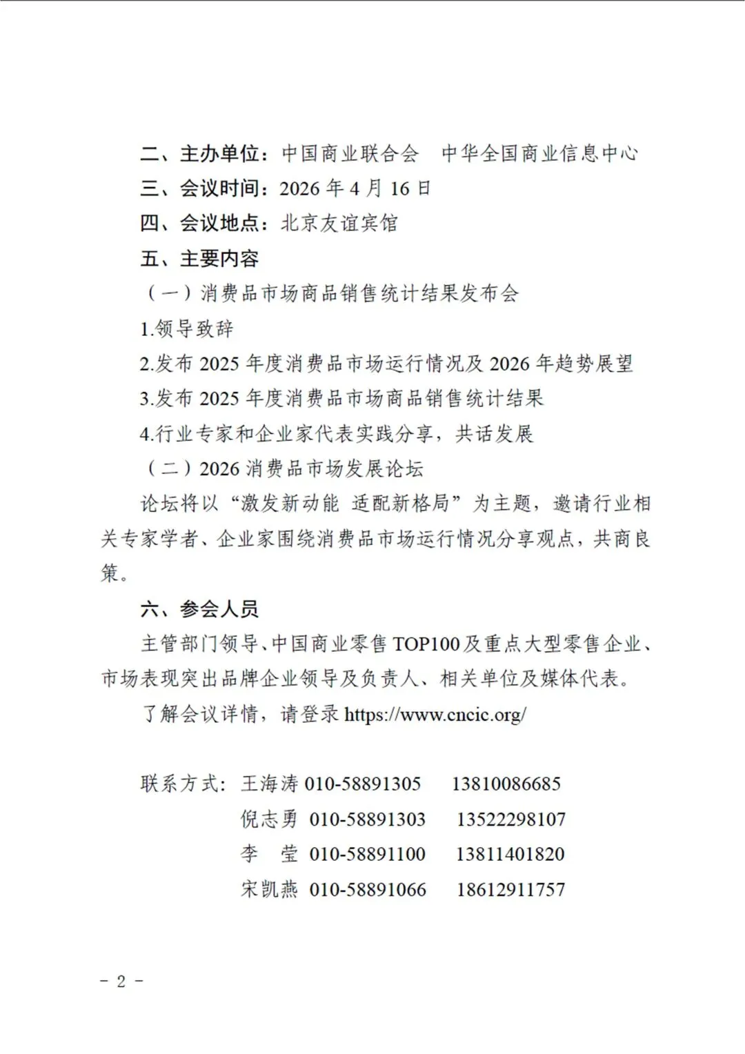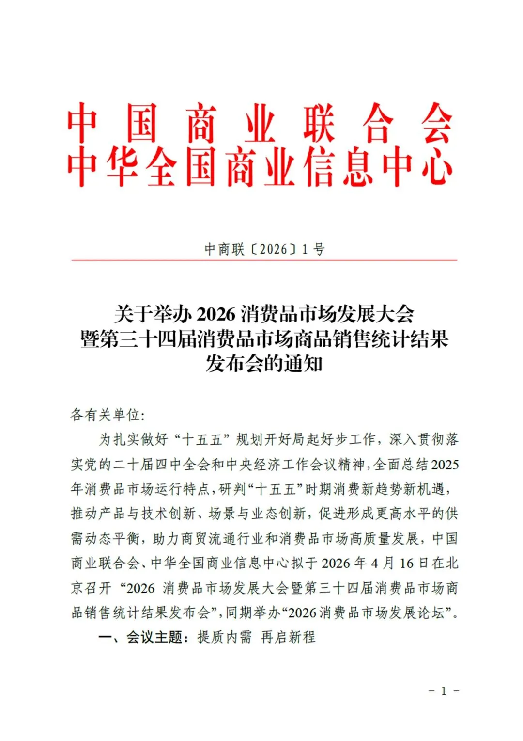 为扎实做好“十五五”规划开好局起好步工作,深入贯彻落实党的二十届四中全会和中央经济工作会议精神,全面总结2025年消费品市场运行特点,研判“十五五”时期消费新趋势新机遇,推动产品与技术创新、场景与业态创新,促进形成更高水平的供需动态平衡,助力商贸流通行业和消费品市场高质量发展,中国商业联合会、中华全国商业信息中心拟定召开“2026 消费品市场发展大会暨第三十四届消费品市场商品销售统计结果发布会”,同期举办“2026消费品市场发展论坛”。