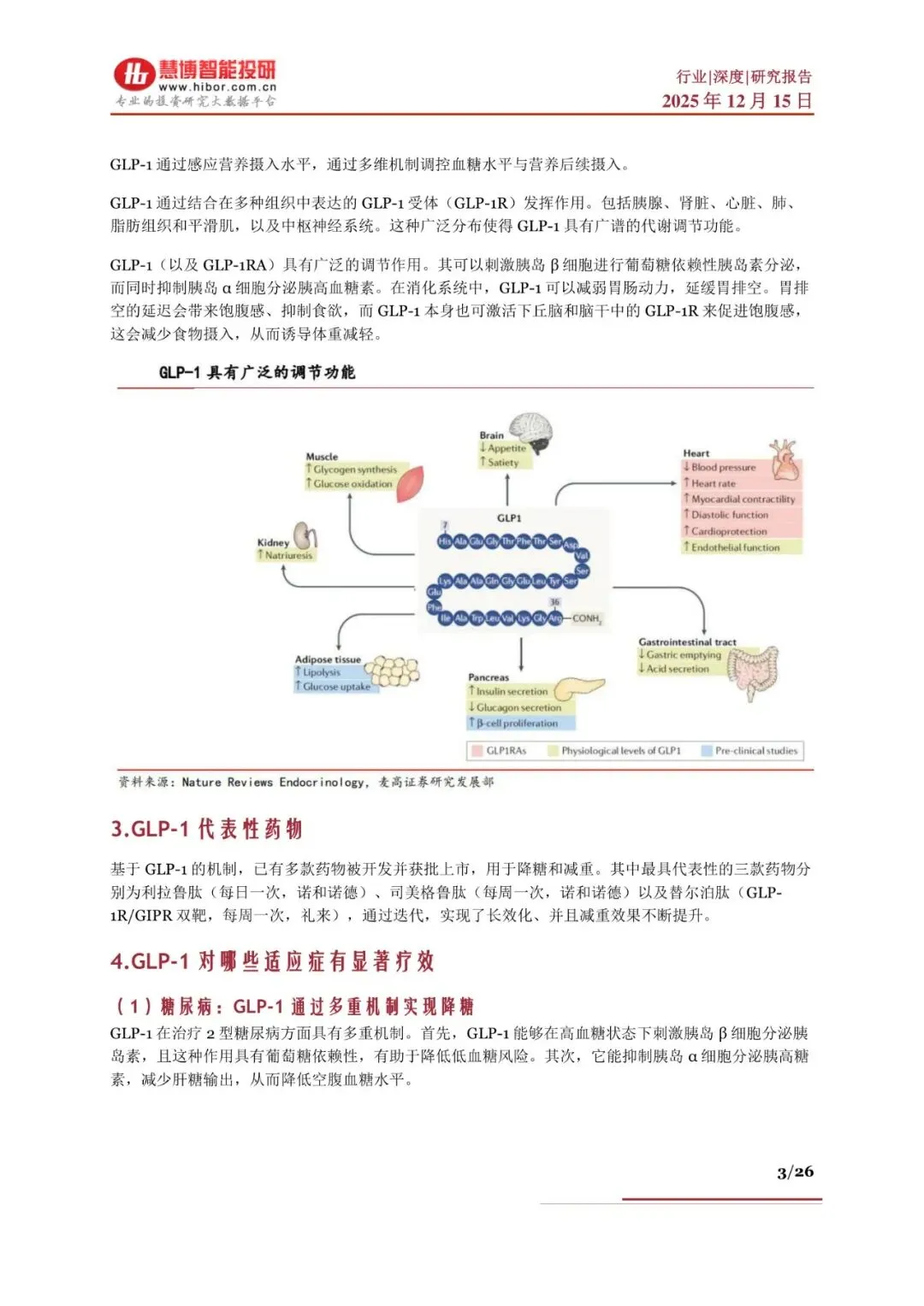 GLP-1(7-36)酰胺由肠道L细胞分泌,通过胰腺-中枢-胃肠多通路实现“葡萄糖依赖性”降糖、延缓胃排空、抑制食欲。代表药物已从日制剂利拉鲁肽迭代至周制剂司美格鲁肽、双靶替尔泊肽,68周减重最高22.5%。除降糖、减重外,LEADER等CVOT显示MACE风险下降13-26%,奠定心血管保护证据。