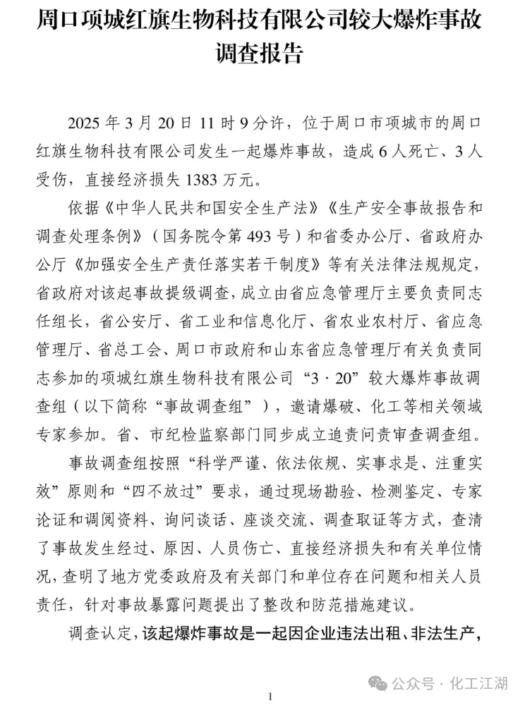 2025年3月20日11时9分许,位于周口市项城市的周口红旗生物科技有限公司发生一起爆炸事故,造成6人死亡、3人受伤,直接经济损失1383万元。
