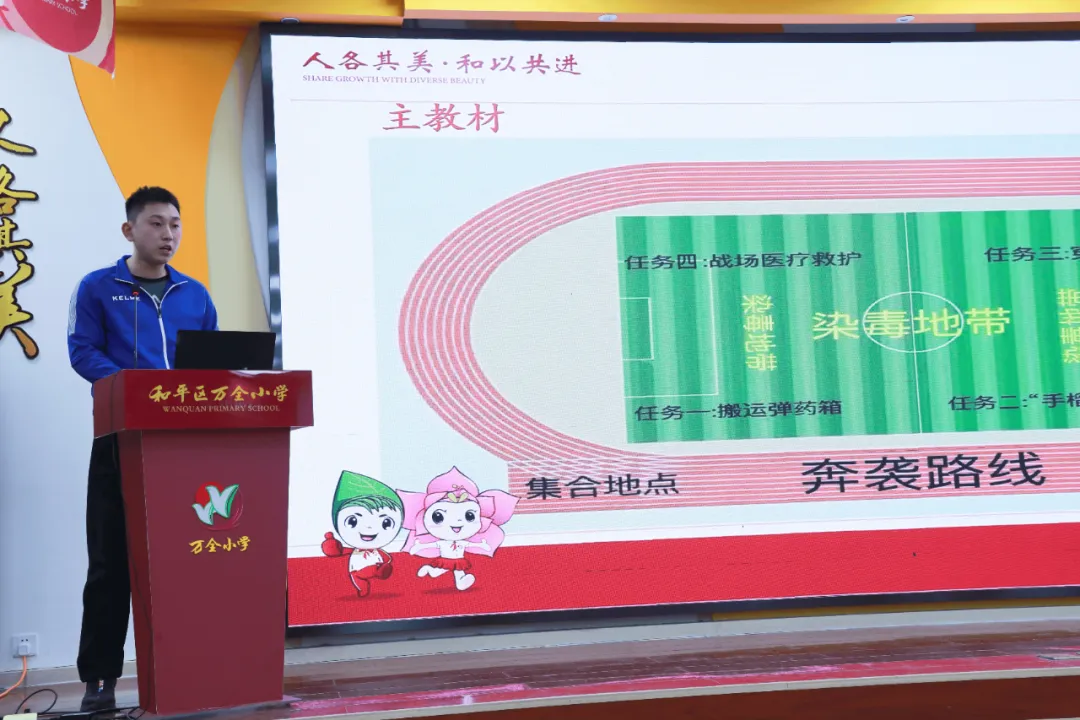 孙鹏老师以《助力深化国防教育,做智勇双全小卫士》为题,分享体育与国防教育的融合实践。课程围绕三大核心素养,设计“搬运弹药箱”、“手榴弹投准”、“穿越火线”、“战场医疗救护”等模拟军事训练任务,通过播放红色影片、队列训练、短促哨音营造沉浸式情境,让学生在完成任务中提升运动技能、掌握急救知识,自然传递国防意识与“强国有我”的担当精神,成效显著。