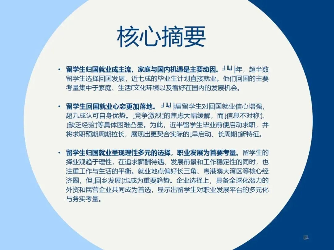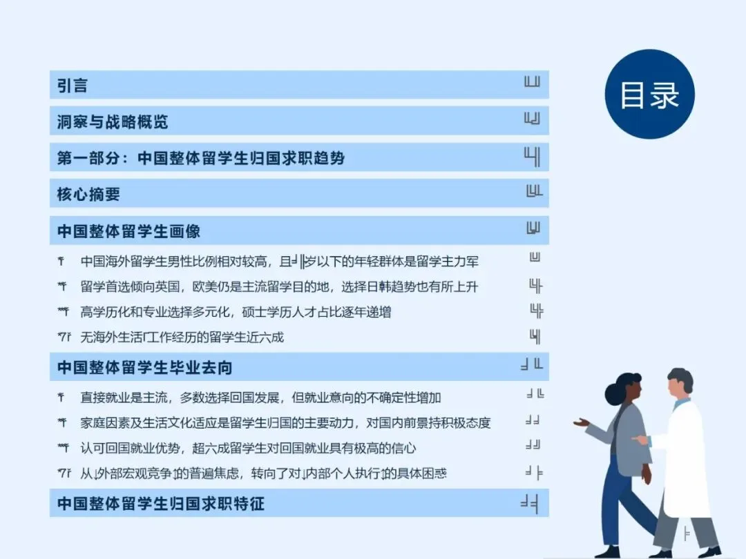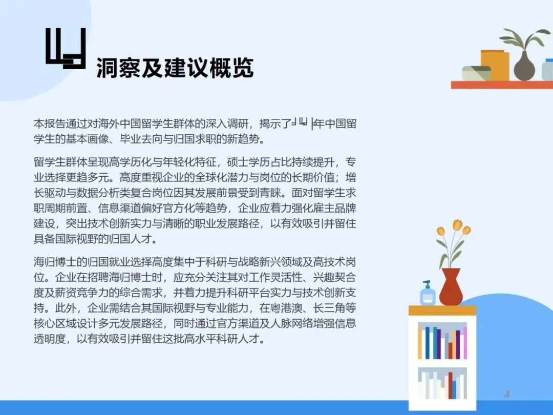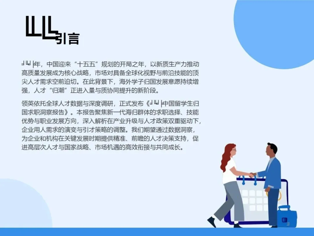 2025年作为十五五规划开局之年,新质生产力推动高质量发展成为核心战略,市场对具备全球化视野与前沿技能的顶尖人才需求空前迫切。在此背景下,海外学子归国发展意愿持续增强,人才“归潮”进入量质协同提升新阶段。本报告依托领英全球人才数据与深度调研,聚焦新一代海归群体的求职选择、技能优势与职业发展方向,深入解析产业升级与人才政策双重驱动下企业用人需求的演变与引才策略调整,揭示了留学生高学历化、年轻化等群体特征及归国求职新趋势,为企业和机构提供精准、前瞻的人才决策支持,促进高层次人才与国家战略、市场机遇的高效衔接。