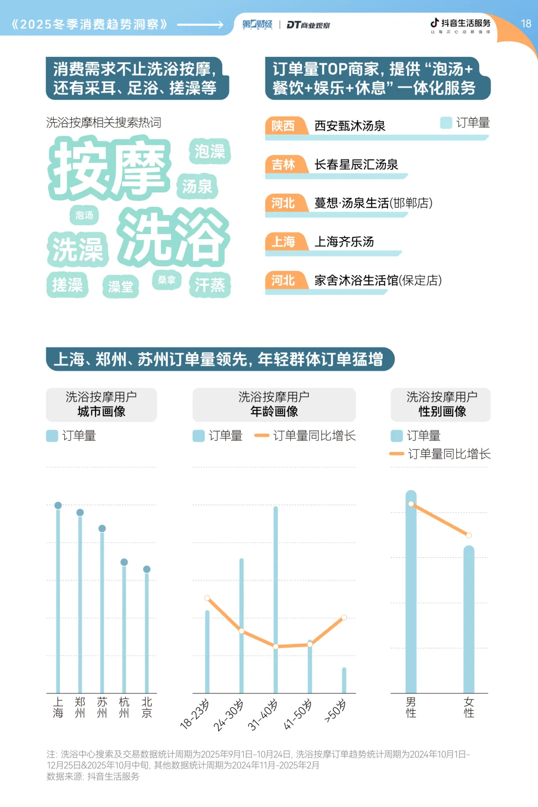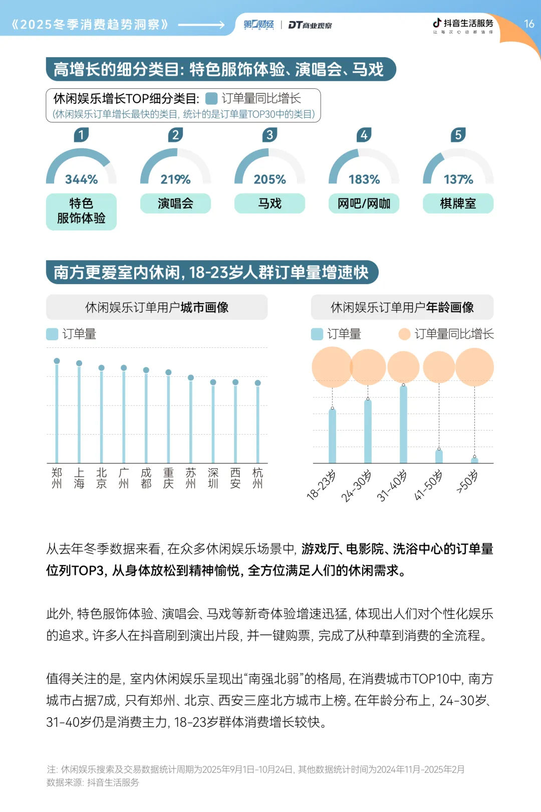 “精致猫冬” 理念兴起,室内休闲场景热度攀升。洗浴中心搜索量同比增长 36%,集泡汤、餐饮、娱乐于一体的综合汤泉成为聚会新据点,年轻群体订单增速显著。游戏厅、电影院等室内娱乐场所订单量名列前茅,南方城市消费需求尤为旺盛。