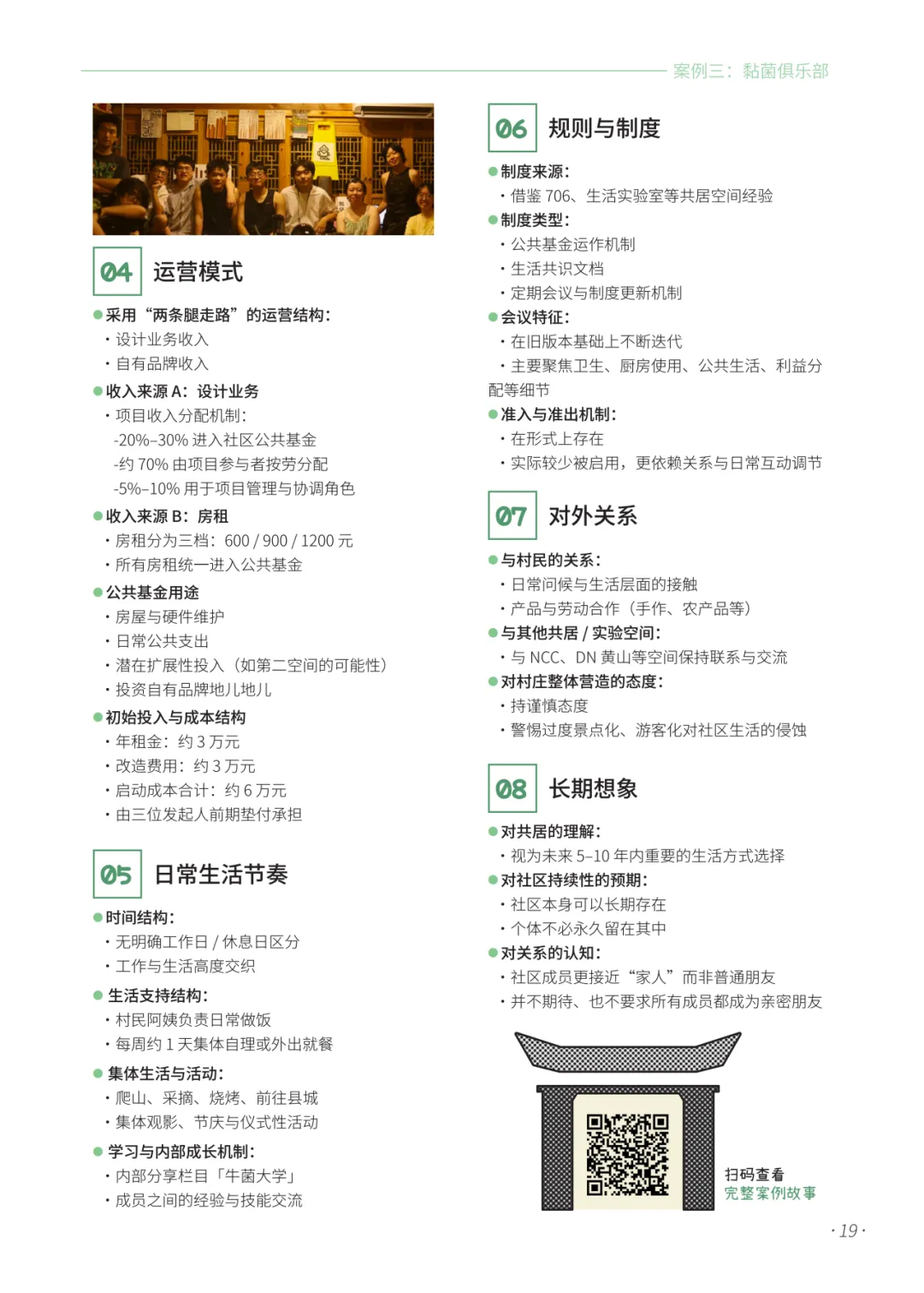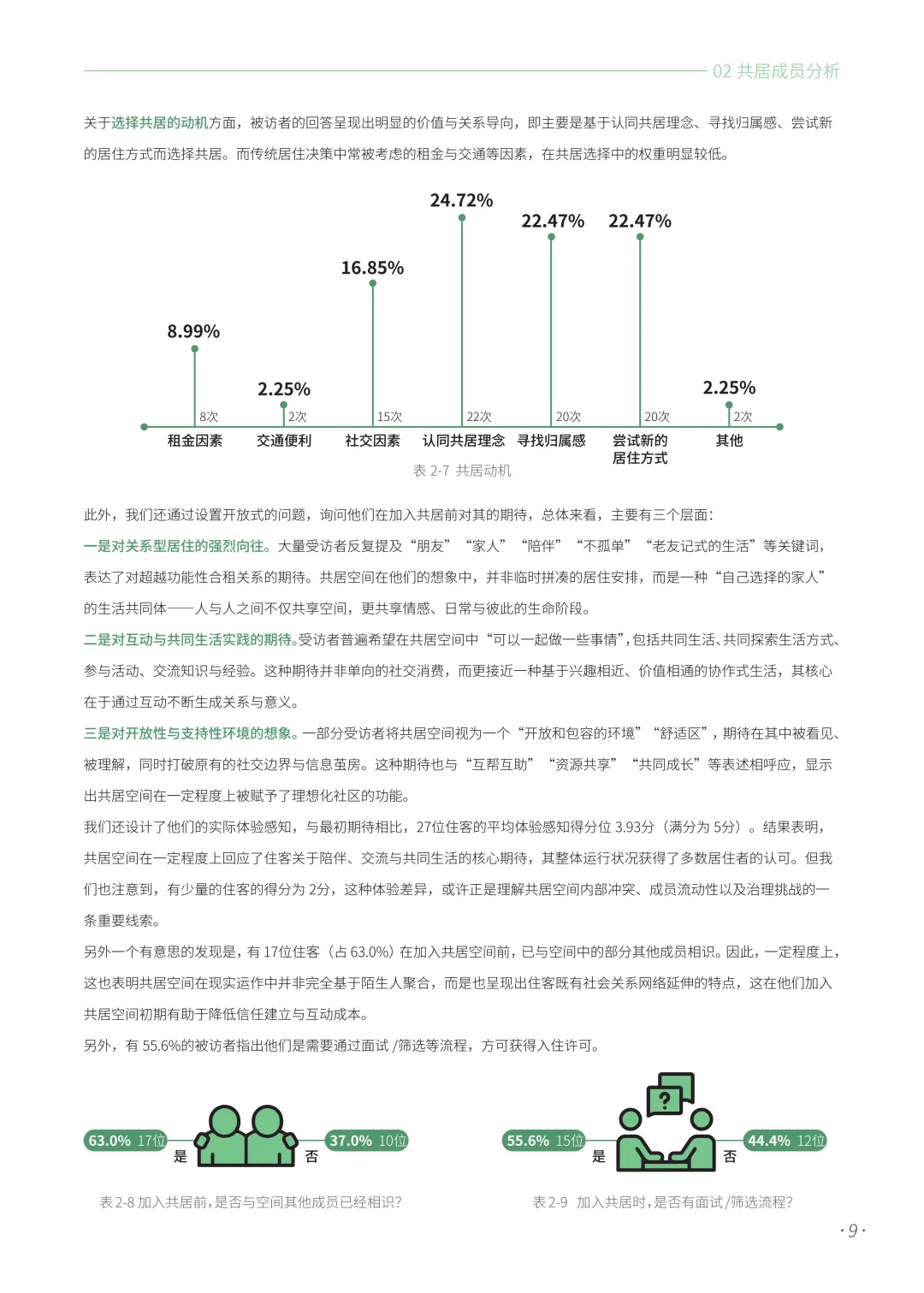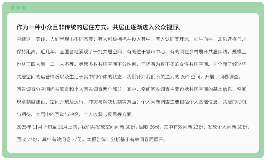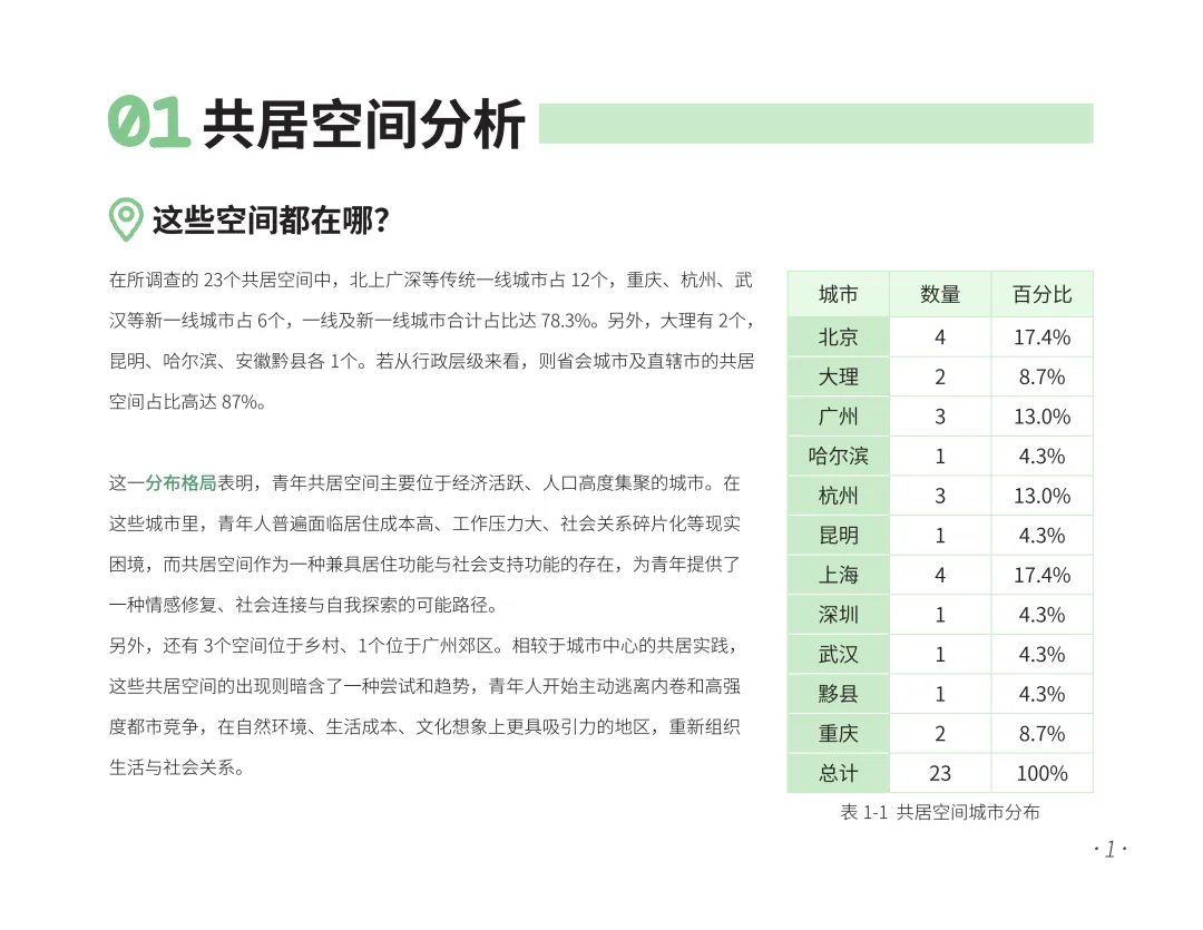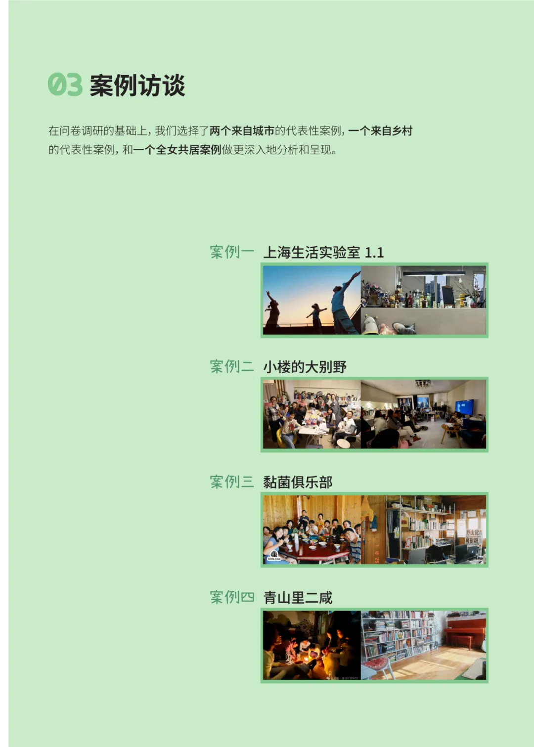 报告分为四个小节,第一二节以问卷调查结果为主,分别分析当下共居空间与空间实践者的发展情况,第三节以访谈为主体,提供四个不同模式下案例的具体经验,最后一节分享了部分共居工具包与联系人名录。