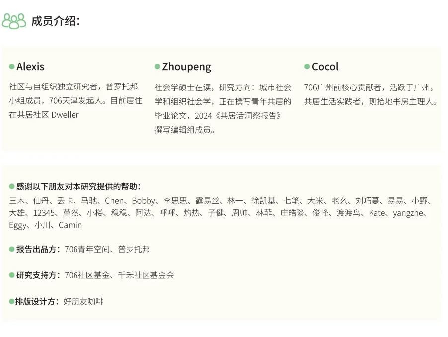 2025年《共居生活洞察报告》在 2024年的报告基础上,从 706青年空间的共居实践范式出发,走入更多元的共居实践形式,通过扫描调查的形式,了解在国内以共居(在本报告中,将共居定义为 30人以下的城市共享居住形式)进行生活和空间实践的行动者,并积累和推广经验。