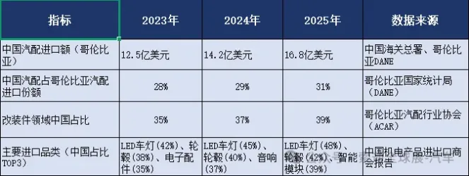 中国份额:占哥伦比亚汽配进口总额(44.2亿美元)的28.3%(2023年哥伦比亚DANE数据)。