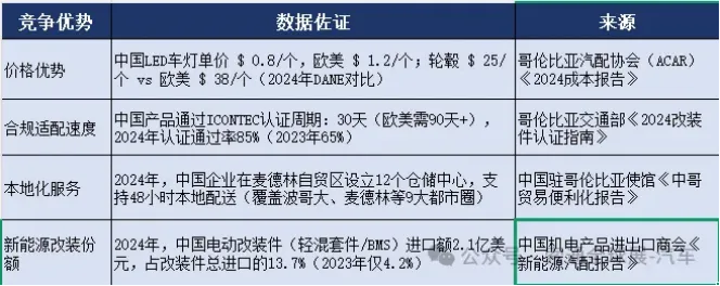 需求刚性:哥伦比亚老旧车占比45%(车龄>10年),改装需求年增12%(DANE 2024年数据),中国产品因性价比成首选。
