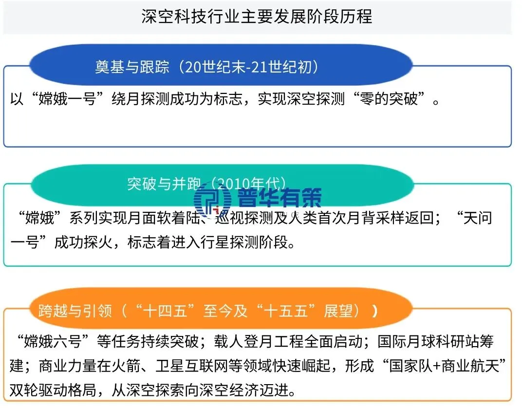 中国深空科技事业始于本世纪初的月球探测工程(“嫦娥工程”),实现了从绕月探测到月面着陆、巡视勘察,再到月球采样返回的“三步走”战略目标,完成了从无到有、由弱到强的历史性跨越。“十四五”期间,“天问一号”成功实现火星环绕、着陆和巡视,标志着深空探测从月球迈向行星际;同时,可重复使用运载火箭、高通量通信卫星等商业航天技术取得突破,产业生态开始孕育。当前,以2030年前实现中国人首次登陆月球为标志,行业正进入以国家重大工程牵引、商业力量广泛参与、AI等颠覆性技术深度融合为特征的“深空经济”发展新阶段。