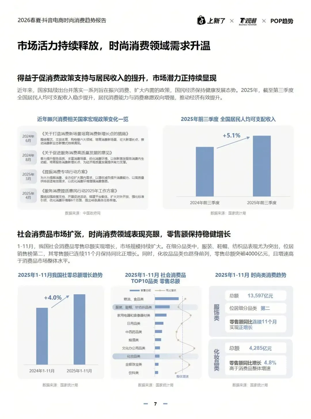 2026春夏时尚消费迈入妆造一体化新阶段,消费者从单一单品选购转向追求风格协同、场景适配与情绪共鸣的完整形象解决方案。抖音电商作为潮流核心阵地,凭借“趋势-内容-转化”生态,推动服饰与彩妆跨品类深度融合。报告基于市场数据与用户洞察,聚焦消费人群需求变革,解析六大趋势风格,洞察各品类机会点,呈现从宏观市场到细分单品的全维度时尚消费图景,为行业提供兼具前瞻性与实操性的参考。