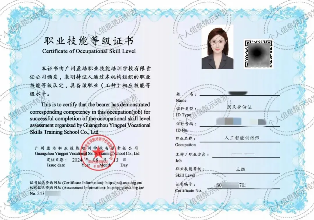 人工智能训练师职业技能证书共分为五个等级,按从低到高的顺序依次为五级至一级。该证书具备全国通用效力,实行“一证一码”管理模式,终身有效,持证者可通过国家官方平台查询验证证书信息,为个人职业发展提供权威认证背书,拓宽职业晋升路径。各等级对应核心能力如下: