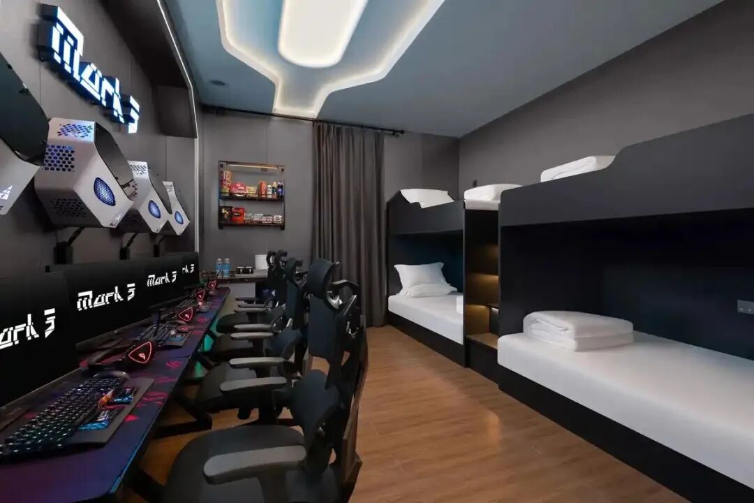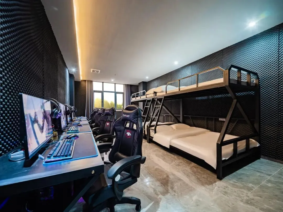 2. 业态复合化:跨界融合拓展边界 电竞酒店将突破“住宿+游戏”的单一模式,向“电竞+文旅+餐饮+直播”跨界融合转型。与游戏厂商、动漫IP、电竞赛事的联名合作将成为常态,通过推出限定主题房、赛事观赛套餐、IP周边零售等,提升品牌溢价;部分门店将融入剧本杀、桌游、健身等业态,打造综合性青年娱乐空间。