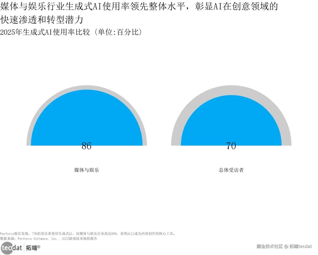 3秒解读:AI在创意领域渗透最快,工具市场从“单一依赖”转向“多元选择”。行动建议:开发者优先引入AI进行素材生成、代码测试与文案创作,降低研发成本;创业者可聚焦AI工具细分场景落地,如AI本地化适配、AI素材优化等,挖掘新机会。生成式AI使用率比较半圆面积比例图表6数据EXCEL及图表PDF模板已分享到会员群