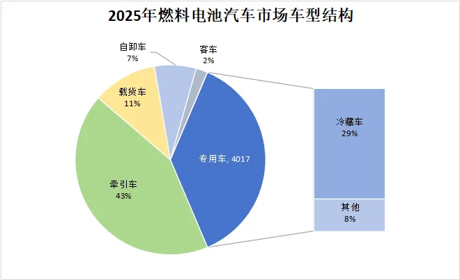 2025年,国内燃料电池汽车销量以牵引车和专用车为主,两大类车型占比80%。由于示范政策支持中远途、中重型燃料电池商用车规模化应用,49吨牵引车成为近年燃料电池汽车重点关注的细分车型,在重载物流、短倒运输、城际干线、长途运输等领域广泛示范,技术适应性和运营经济性优势初步显现,并得到市场验证。专用车中重点细分车型4.5吨冷藏车直击冷链运输痛点,续驶里程普遍超过400公里,凭借快速补能、低温运行稳定、TCO成本竞争力逐步提升等优势,在北京、广东、河南等多地投入规模化商业运营,2025年销量达到3096辆,同比增长138.2%。